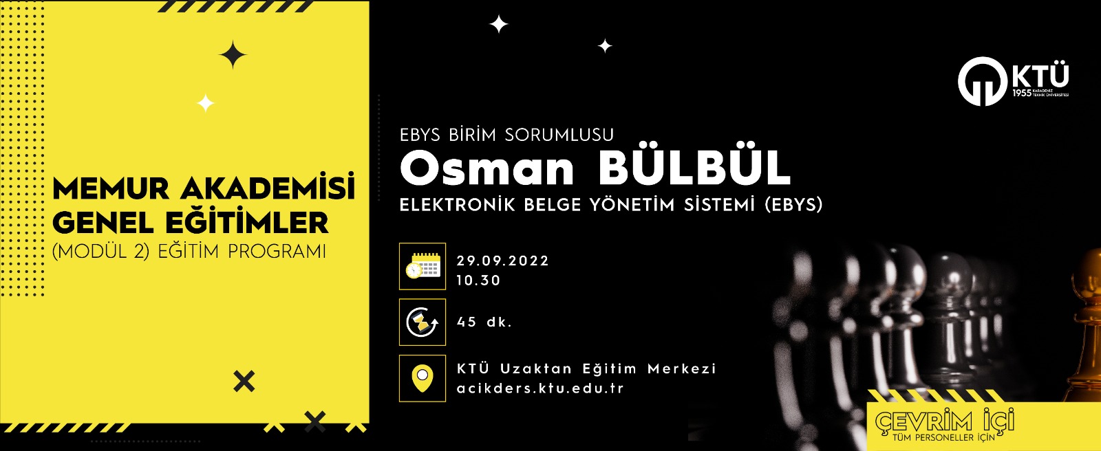 EBYS Birim Sorumlusu Osman BÜLBÜL tarafından tüm personellerimiz için çevrim içi (KTÜ Uzaktan Eğitim Sistemi) olarak "Elektronik Belge Yönetim Sistemi" eğitimi 29.09.2022 tarihinde saat 10.30'da yapılacak ve 45 dakika sürecektir.
