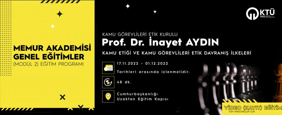 Kamu Görevlileri Etik Kurulundan Prof. Dr. İnayet AYDIN tarafından hazırlanan video (kayıt) eğitimi Cumhurbaşkanlığı İnsan Kaynakları Ofisi (CBİKO) Uzaktan Eğitim Kapısı aracılığı ile sunulacaktır.