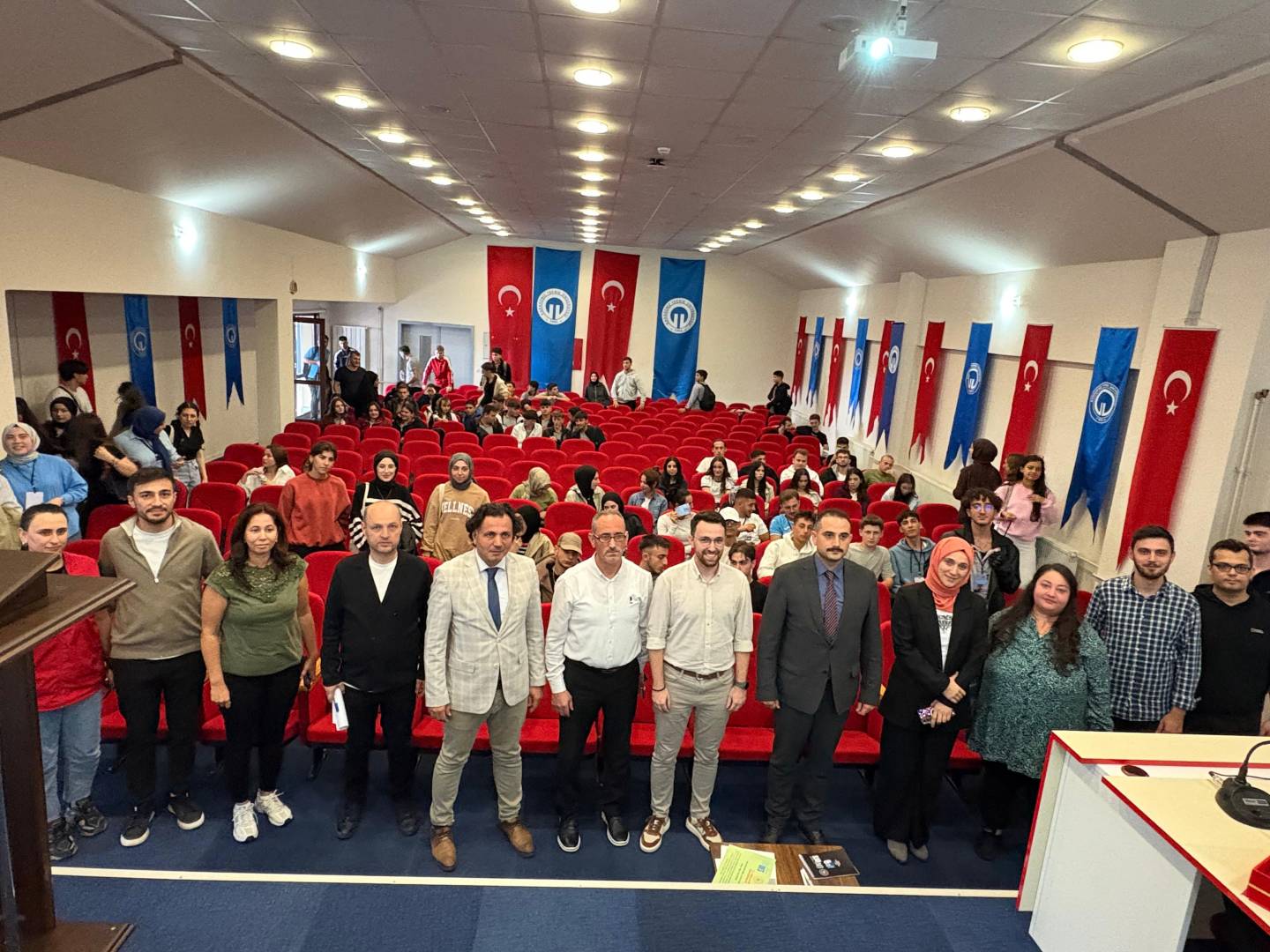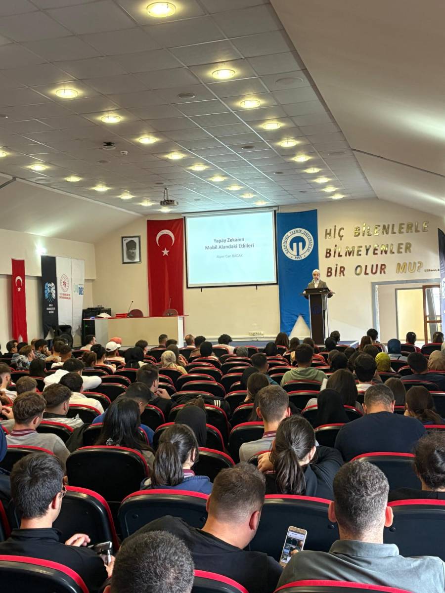 Konferansın konuşmacısı Aryom Yazılım’dan Alperen Can Bacak, yapay zekânın mobil alanındaki gelişmeleri, günlük yaşama etkilerini ve gelecekte bizleri bekleyen yenilikleri aktardı. Öğrencilerin dikkatle takip ettiği sunumun ardından, Alperen Bey katılımcıların yoğun ilgi gösterdiği soruları yanıtladı ve öğrencilerle kısa bir sohbet gerçekleştirdi.