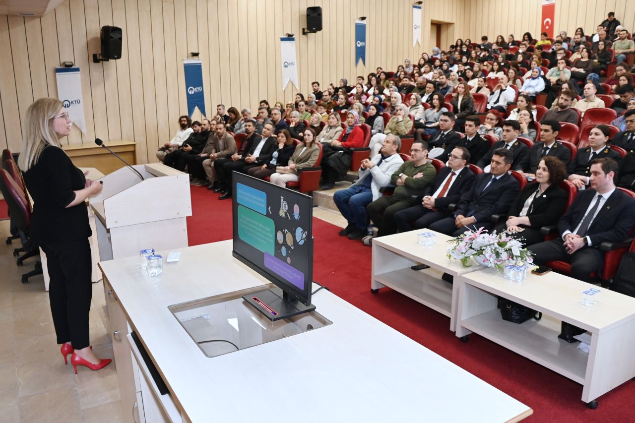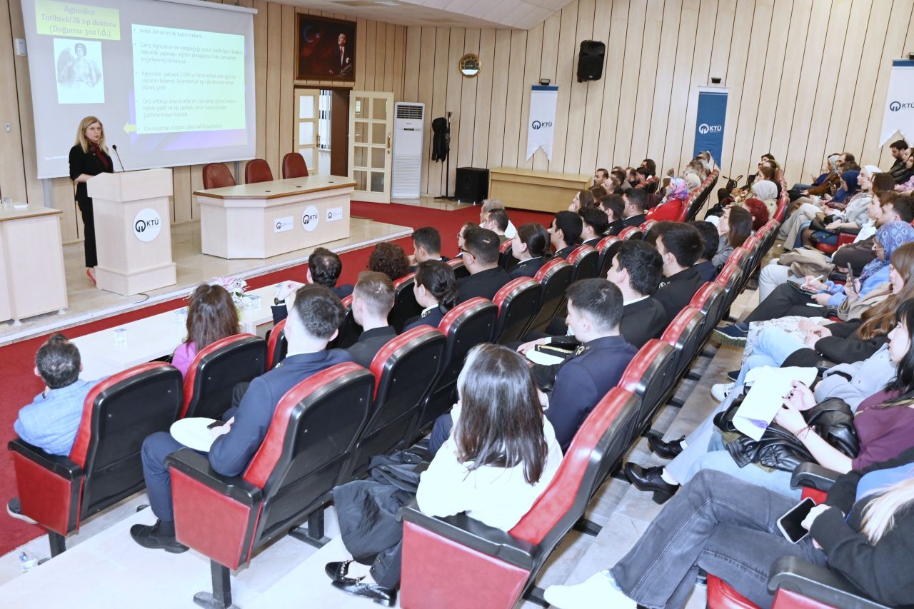 Üniversitemiz, Türkiye Bilimler Akademisi (TÜBA) iş birliğiyle düzenlenen “TÜBA-Üniversite Konferansları” kapsamında önemli bir bilimsel etkinliğe ev sahipliği yaptı. TÜBA Konsey Üyesi ve Lokman Hekim Üniversitesi Eczacılık Fakültesi Dekanı Prof. Dr. İlkay ERDOĞAN ORHAN tarafından gerçekleştirilen “Bilim Tarihinde İz Bırakan Kadınların Sessiz Mirası” başlıklı konferans, yoğun katılımla KTÜ Fen Fakültesi Nazım Terzioğlu Amfisi’nde düzenlendi. Bilim tarihine önemli katkılar sunmuş ancak çoğu zaman görünürlükleri sınırlı kalmış kadın bilim insanlarının ele alındığı konferans, akademisyenler ve öğrenciler tarafından ilgiyle takip edildi. Konferans kapsamında üniversitemizi ziyaret eden Prof. Dr. İlkay ERDOĞAN ORHAN, KTÜ Rektörü Prof. Dr. Hamdullah ÇUVALCI’yı da makamında ziyaret etti. Gerçekleştirilen ziyarette üniversitemizde yürütülen bilimsel çalışmalar ve akademik iş birlikleri üzerine görüş alışverişinde bulunuldu.
