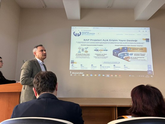 Bilimsel Araştırma Projeleri (BAP) Koordinasyon Birimi tarafından ise; açık erişim yayın desteği, başvuru süreçleri ve hizmet alımı kapsamında izlenmesi gereken adımlar hakkında katılımcılara bilgi verilmiş, gerekli belgeler ve dikkat edilmesi gereken hususlar paylaşılmıştır.