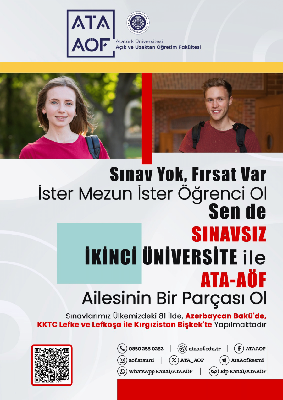 ATA-AÖF, Türkiye’deki tüm üniversite öğrencilerine ve mezunlarına, herhangi bir sınav koşulu olmaksızın farklı bir alanda eğitim alma fırsatı tanımaktadır. Sınavsız İkinci Üniversite başvuruları 17 Ekim 2025 tarihine kadar devam edecektir.