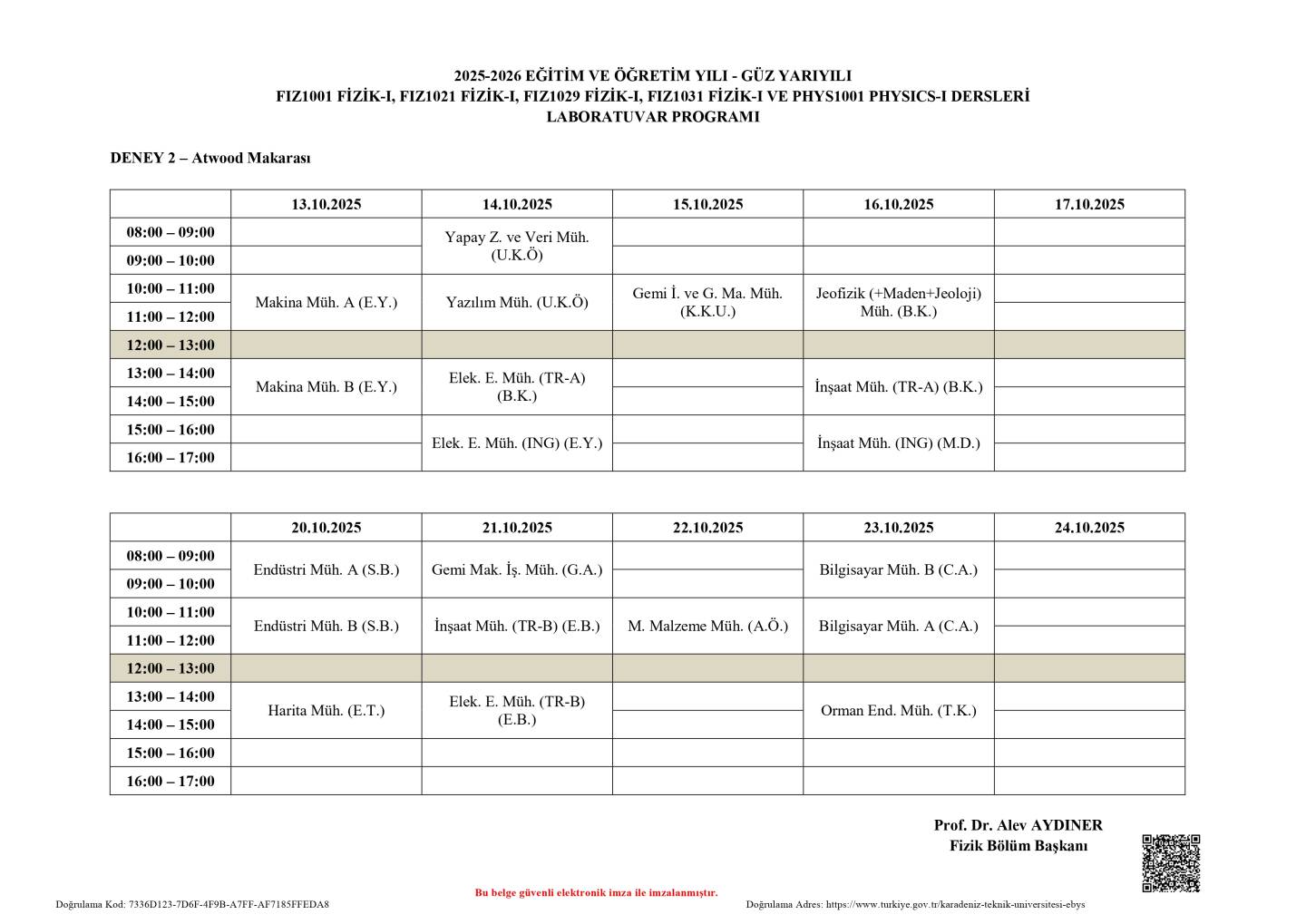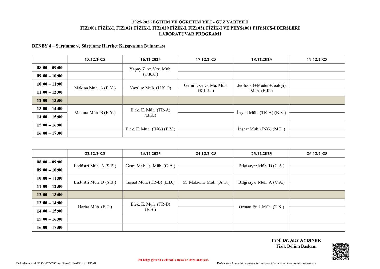 Bilgisayar Mühendisliği öğrencilerine yönelik Fizik dersi laboratuvar programı ilan edilmiştir.