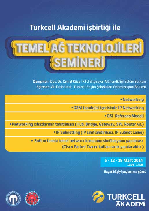 Turkcell firması bölümümüzde “Temel Networking Semineri” konu başlıklı bir seminer sunacaktır.