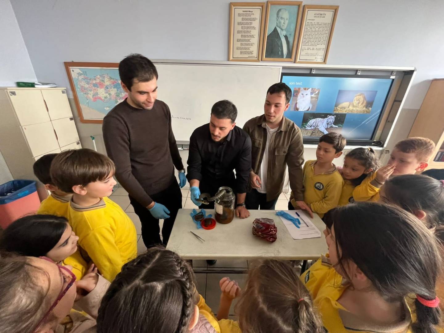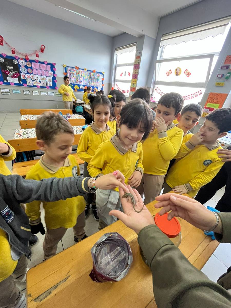 Etkinlikte kurbağa, semender, kertenkele ve yılan gibi hayvanlar öğrencilere tanıtılarak, bu canlıların doğal yaşam alanları ve ekosistemdeki rolleri hakkında bilgiler paylaşılmıştır. Çocuklar, bu hayvanları yakından görme ve merak ettikleri soruları sorma fırsatı bulurken, doğaya zarar vermeden canlıları tanımanın ve korumanın önemi vurgulanmıştır. Sunum boyunca öğrencilerin ilgisi ve heyecanı dikkat çekmiştir.