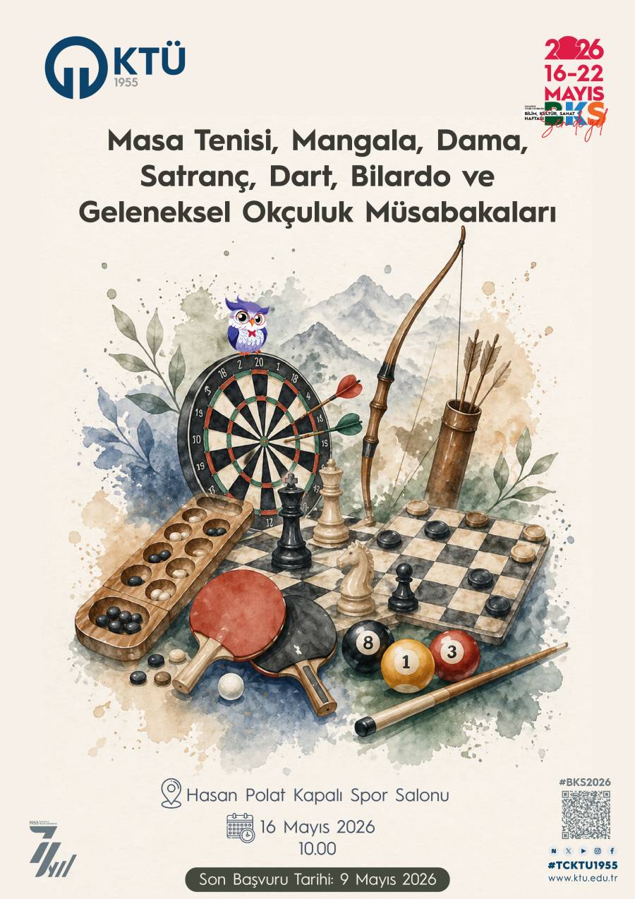 Karadeniz Teknik Üniversitesi öğrencilerine yönelik düzenlenecek olan “Masa Tenisi, Mangala, Dama, Satranç, Dart, Bilardo ve Geleneksel Okçuluk Müsabakaları”, BKS Haftası etkinlikleri kapsamında gerçekleştirilecektir.