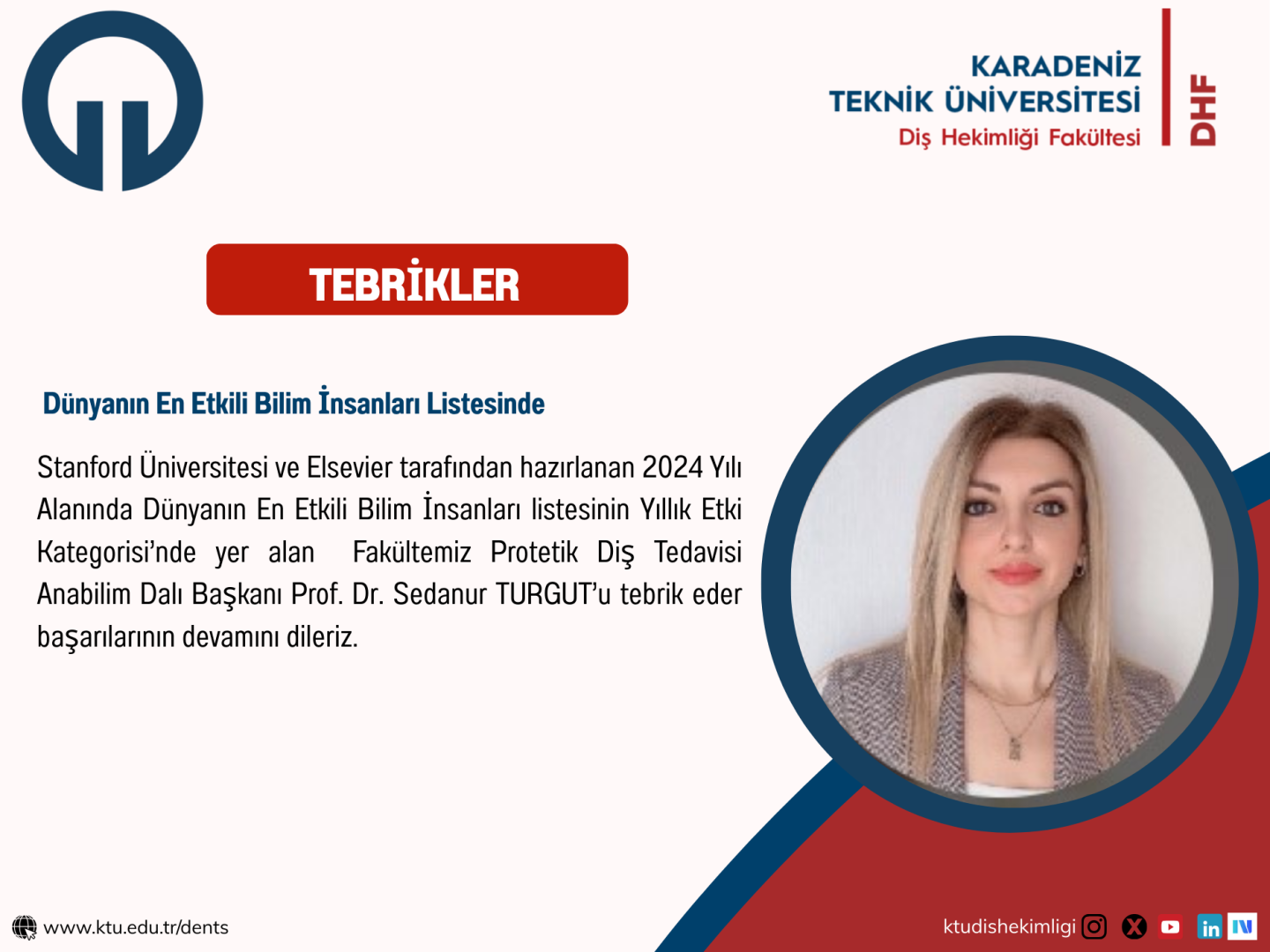 Stanford Üniversitesi ve Elsevier tarafından hazırlanan 2024 Yılı Alanında Dünyanın En Etkili Bilim İnsanları listesinin Yıllık Etki Kategorisi’nde yer alan Fakültemiz Protetik Diş Tedavisi Anabilim Dalı Başkanı Prof. Dr. Sedanur TURGUT’u tebrik eder başarılarının devamını dileriz.