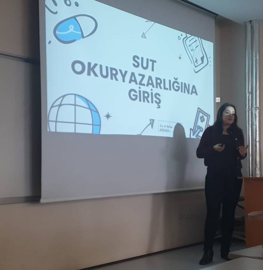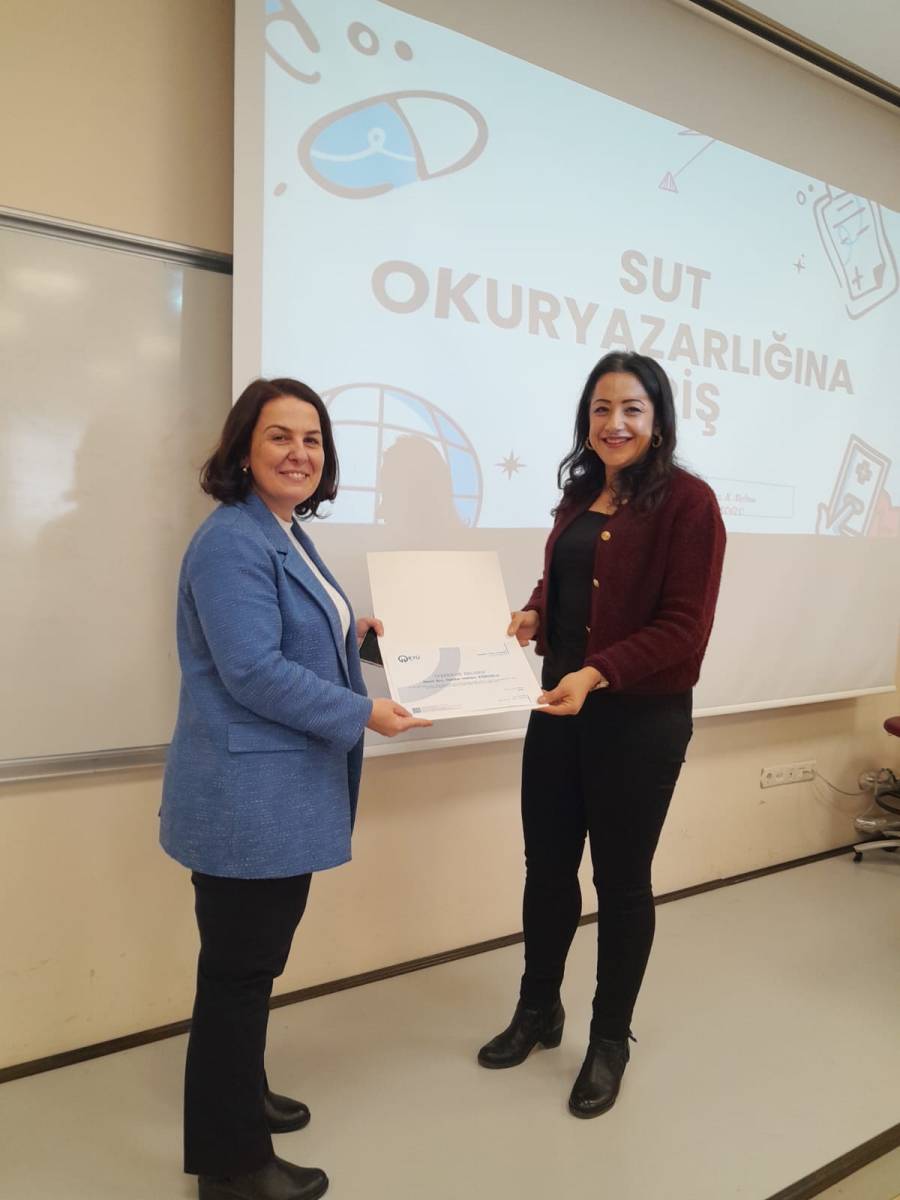 24 Aralık 2025 tarihinde gerçekleştirilen derste sayın Ecz. Nezihe Meltem KÖROĞLU, "Sağlık Uygulama Tebliği Okuryazarlığına Giriş" başlıklı seminer verdi. Dersin sonunda Fakültemiz Dekanı Prof. Dr. Gülin RENDA, Ecz. Nezihe Meltem KÖROĞLU'na teşekkür belgesi takdim etti.