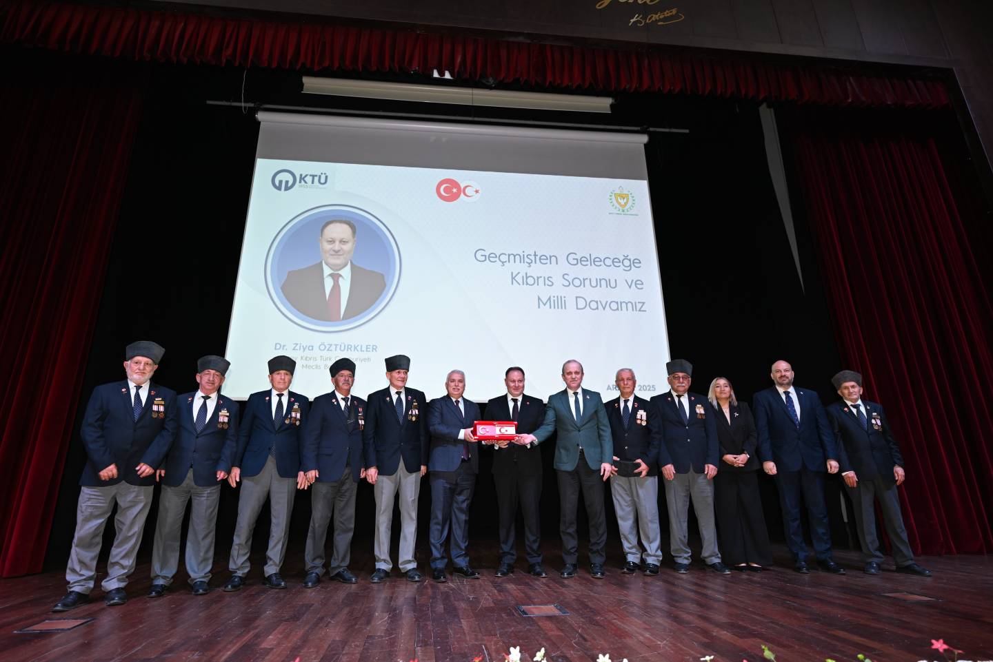 The program began with a moment of silence and the Turkish National Anthem, followed by the screening of the “KTU Introductory Film” and the themed video “Independence Is in Our Spirit,” prepared by our University’s Corporate Communication Office Radio/TV Unit. In the opening remarks, Rector Prof. Dr. Hamdullah ÇUVALCI emphasized the significance of gathering to revisit the historical memory of the Cyprus issue and to strengthen a shared awareness for the future. He noted that hosting Dr. Ziya ÖZTÜRKLER, Speaker of the Parliament of the Turkish Republic of Northern Cyprus, was a great honor for the University. Rector ÇUVALCI underlined that Dr. ÖZTÜRKLER’s extensive experience, both in academia and public service, offers valuable insights into the Cyprus question. He stressed that the conference would not only provide an overview of past developments but also contribute to a forward-looking understanding of the issue. Highlighting the multifaceted nature of the Cyprus cause, the Rector stated that it is more than a geographical matter; it carries historical, political, cultural, and identity-based dimensions that deeply resonate within the Turkish nation. He emphasized that the Cyprus cause is a national responsibility that every generation must understand anew and protect. Within this context, he pointed out that the program holds particular importance for strengthening young people’s sense of history and awareness of national issues.