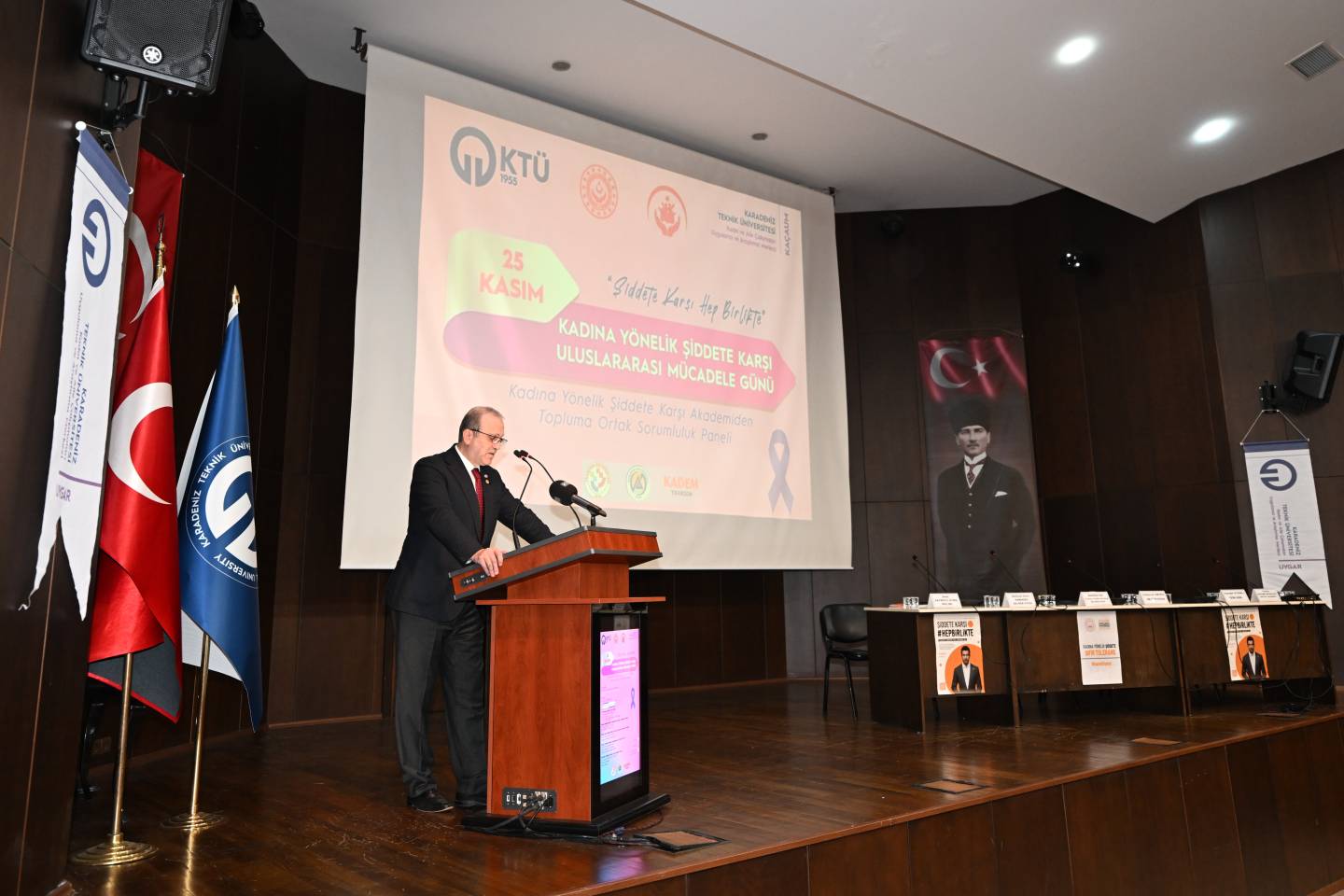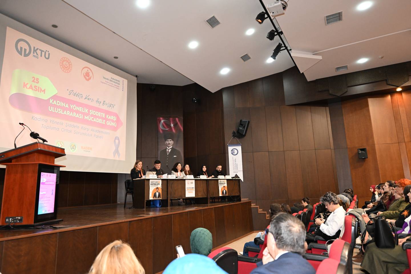 A panel titled “Shared Responsibility from Academia to Society in Combating Violence Against Women” was held at the Prof. Dr. Osman Turan Cultural and Congress Center under the coordination of our University’s Women and Family Studies Application and Research Center (KAÇAUM), in partnership with the Provincial Directorate of Family and Social Services, Trabzon University, Avrasya University, and the Women and Democracy Association (KADEM). The event was organized within the scope of the International Day for the Elimination of Violence Against Women, observed on 25 November.