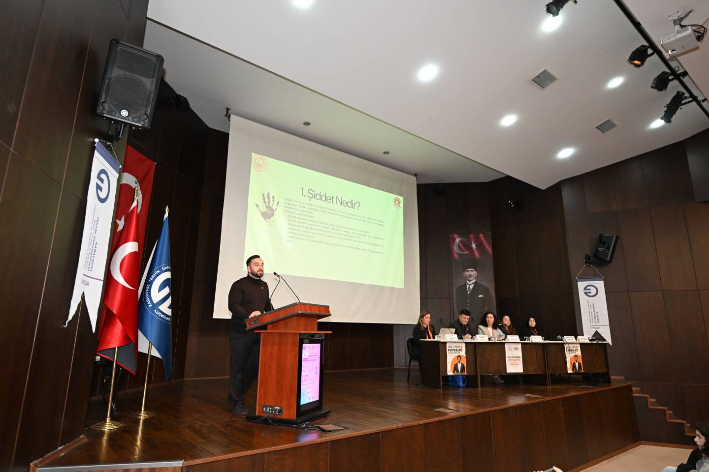 The program began with a moment of silence and the Turkish National Anthem. Delivering the opening speech, our Rector Prof. Dr. Hamdullah ÇUVALCI stated, “All forms of violence, no matter who commits it or whom it targets, are unacceptable. Violence against women, however, stands out as one of the gravest assaults on human dignity, and it deeply disrupts the very foundations of society. As you know, ‘woman’ is the one who holds the family together, raises generations, and embodies the moral compass of society, deserving of the utmost respect, dignity, and trust. At this point, I would like to recall the words of our Prophet Muhammad: ‘The best of you are those who treat women in the best manner.’ This saying is both a measure of humanity and a fundamental principle of civilization. Any act that harms a woman violates this principle and is something society must never accept.”