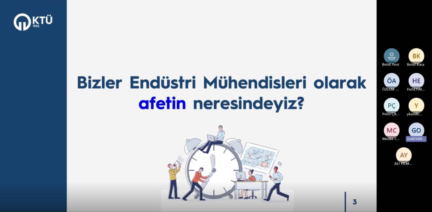 Karadeniz Teknik Üniversitesi Endüstri Mühendisliği Bölümü tarafından düzenlenen seminer kapsamında, bölümümüz öğretim üyelerinden Doç. Dr. Gökhan Özçelik, “Afet Yönetiminde Optimizasyon: Belirsizlik Altında Karar Verme Sanatı” başlıklı sunumunu gerçekleştirdi.