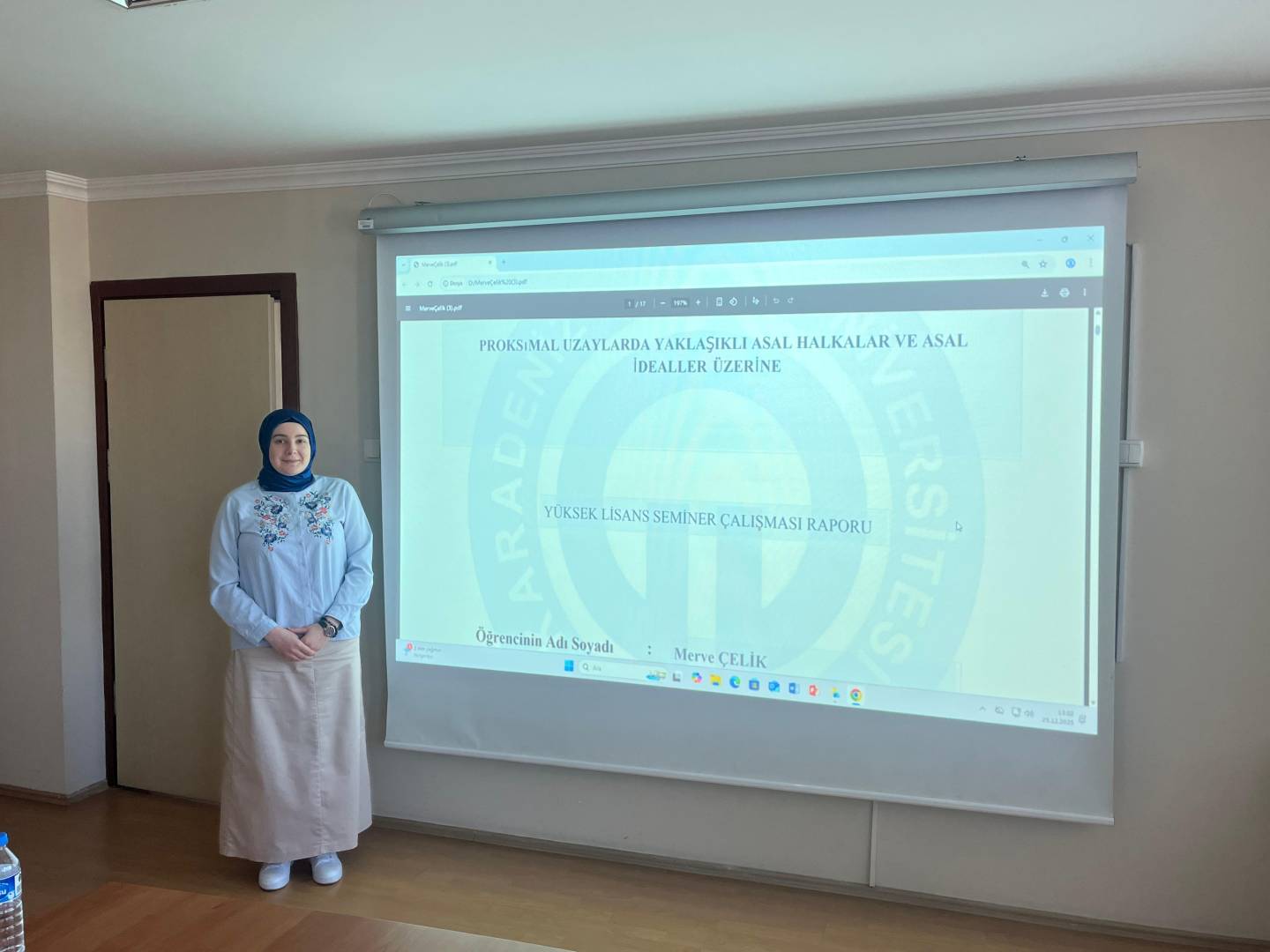 Anabilim Dalımız lisansüstü öğrencilerinden Merve ÇELİK, "Proksimal Uzaylarda Yaklaşıklı Asal Halkalar ve Asal İdealler Üzerine" başlıklı seminer çalışmasını 29/12/2025 tarihinde başarıyla sunmuştur.  Kendisini ve danışmanı Doç. Dr. Tane VERGİLİ'yi tebrik eder gelecekteki çalışmalarında başarılar dileriz.