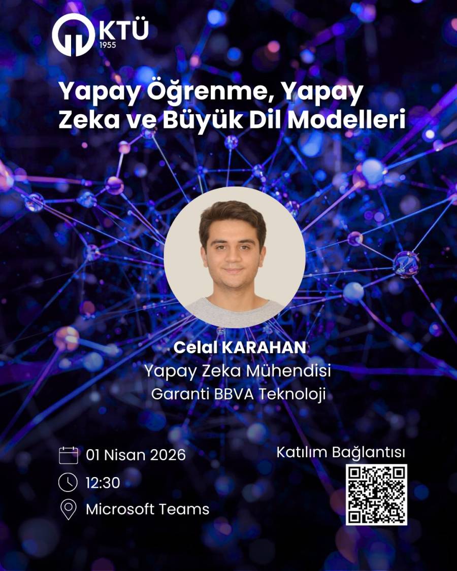 Karadeniz Teknik Üniversitesi mezunlarımızdan Celal Karahan (AI Engineer, Garanti BBVA Teknoloji) ile “Yapay Öğrenme, Yapay Zeka ve Büyük Dil Modelleri” başlıklı çevrim içi bir etkinlik gerçekleştirilecektir.