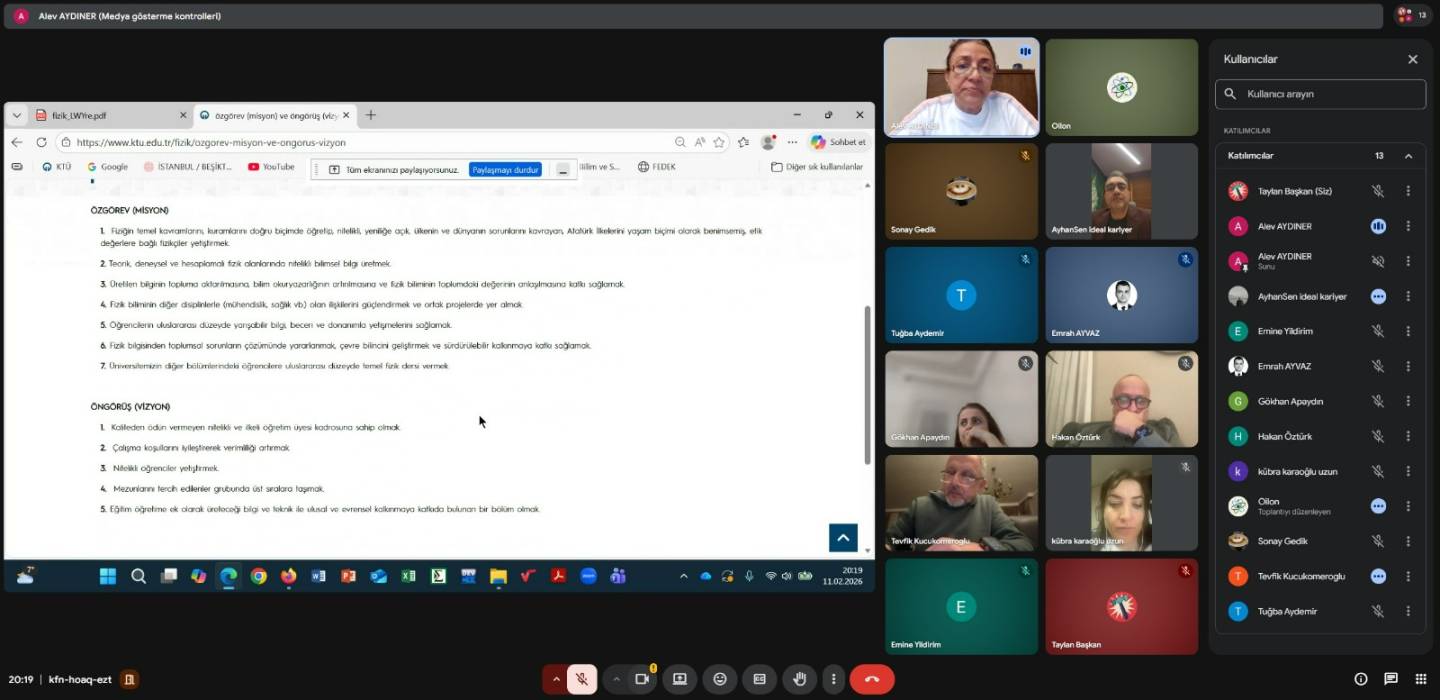 11 Şubat 2026 tarihinde çevrimiçi olarak gerçekleştirilen Fizik Bölümü 3. Dış Paydaş Toplantısında, 2025–2026 Eğitim-Öğretim Yılı güz yarıyılı faaliyetleri değerlendirilmiş ve bahar dönemi için planlanan çalışmalar ele alınmıştır.