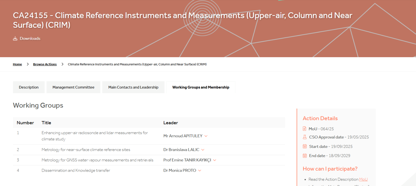 19 Eylül 2025 tarihinde düzenlenen CA24155-CRIM’in “1st Management Committee Meeting” toplantısı, 16 ülkeden yönetim komitesi temsilcilerinin katılımıyla düzenlenmiştir. Aksiyonun ilk resmi toplantısı olan bu etkinlikte, aksiyon başkanı, aksiyonun 4 (dört) bilimsel çalışma grubu ve 2 (iki) idari çalışma gruplarının başkanlarının seçimi gerçekleştirilmiştir. Toplantıda öğretim üyemiz Prof. Dr. Emine Tanır Kayıkçı, aksiyon başkanı Dr Andrea MERLONE’nun (Istituto Nazionale di Ricerca Metrologica/İtalya) teklifi ve 16 ülkenin yönetim komitesi temsilcilerinin oy birliği kararı ile “WG3:Metrology for GNSS water vapour measurements and retrievals” başlıklı bilimsel çalışma grubuna başkan olarak seçilmiştir.