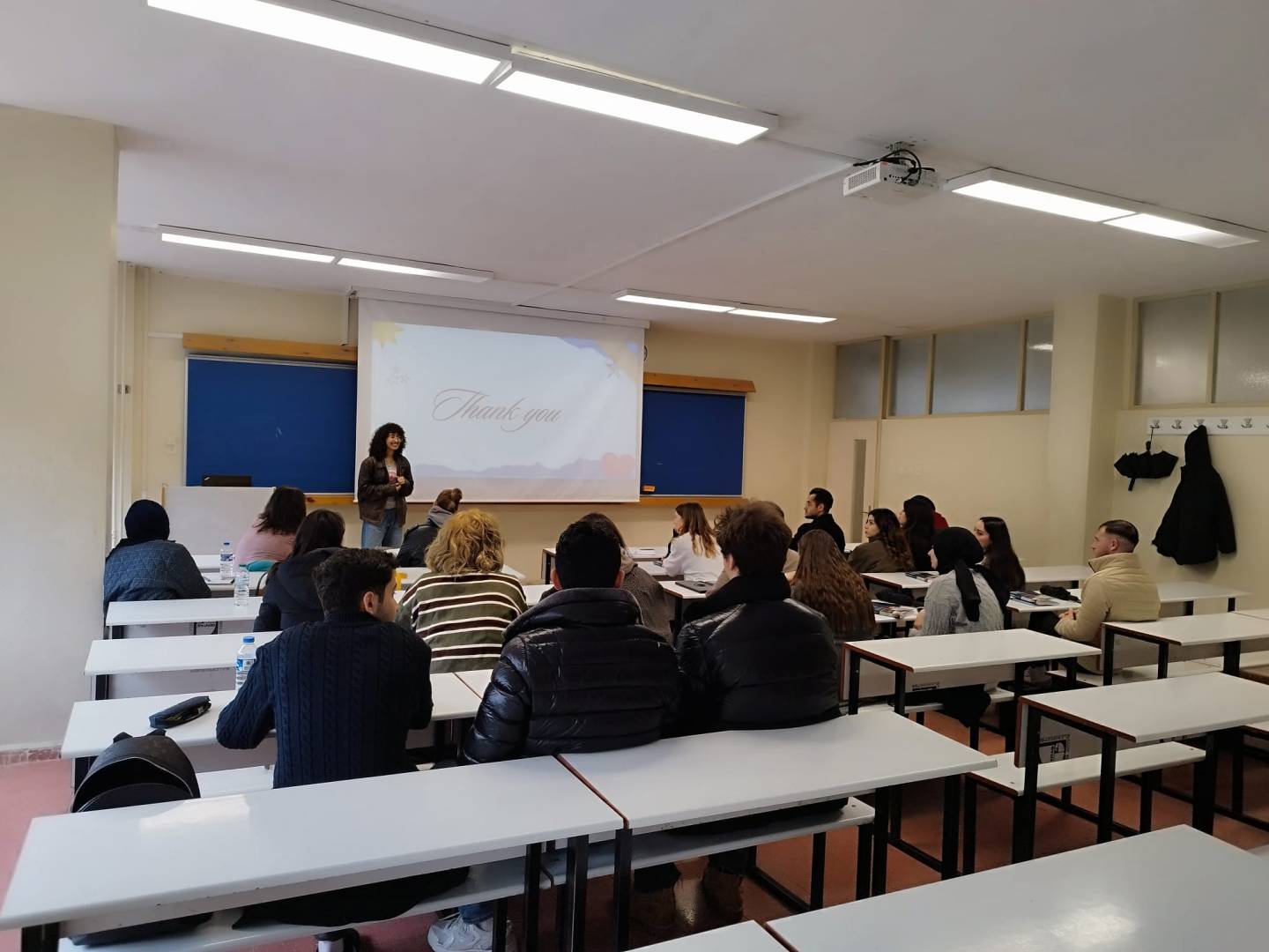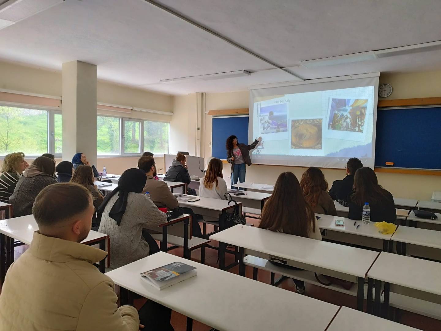 Erasmus+ Öğrenim Hareketliliği programıyla Üniversitemizde eğitim gören Bilgisayar Bilimleri Bölümü öğrencisi Sarra Saidani, Bölümümüzden aldığı Mesleki İngilizce-II dersi kapsamında ülkesi Tunus’u tanıtan ve Erasmus deneyimini paylaşan bir sunum gerçekleştirdi. Sarra, sınıf arkadaşlarından büyük beğeni alan sunumunu kendisine yöneltilen soruları cevaplayarak sonlandırdı. Ders sonunda, kendisine yapılan doğum günü sürprizini memnuniyetle karşılayan öğrencimize derse ve bölümüze verdiği katkı için teşekkür ediyoruz. Sınıf içi etkinliğe aktif katılım gösteren bölüm öğrencilerimize ayrıca teşekkür ediyoruz.
