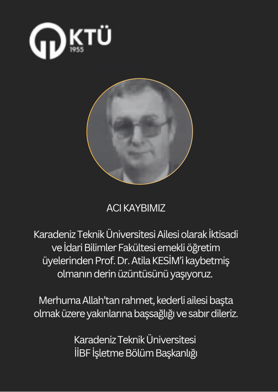Karadeniz Teknik Üniversitesi Ailesi olarak İktisadi ve İdari Bilimler Fakültesi emekli öğretim üyelerinden Prof. Dr. Atila KESİM’i kaybetmiş olmanın derin üzüntüsünü yaşıyoruz.