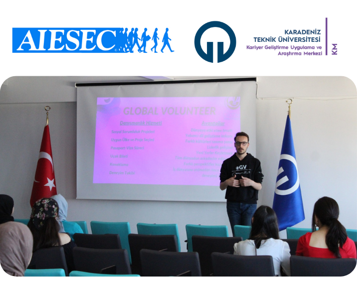 Karadeniz Teknik Üniversitesi Kariyer Geliştirme Uygulama ve Araştırma Merkezi’nin AIESEC Trabzon temsilcileriyle düzenlediği “AIESEC ile Yurt Dışında Staj ve Gönüllülük Fırsatları” adlı etkinlik 11 Mayıs 2022 tarihinde gerçekleştirildi.
