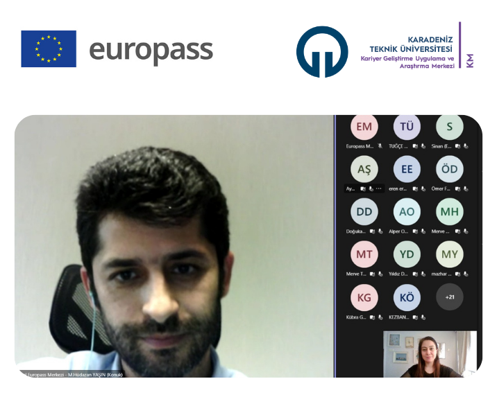 KTÜ Kariyer Geliştirme Uygulama ve Araştırma Merkezi ve Europass ortaklığıyla düzenlenen “Europass CV Hazırlama Teknikleri” başlıklı etkinliğimiz 30 Kasım 2021 tarihinde online olarak gerçekleştirildi. KTÜ Kariyer Geliştirme Uygulama ve Araştırma Merkezi Müdür Yardımcısı Öğr. Gör. Setenay ŞEVİK’in moderatörlüğünde Mesleki Yeterlilik Kurumu Ulusal Europass Merkezi Proje Uzmanı M. Hüdazan YAŞIN’ın sunumuyla gerçekleştirilen etkinliğimize çeşitli üniversitelerden akademisyen ve öğrencilerden oluşan 81 kişi katılım sağladı.