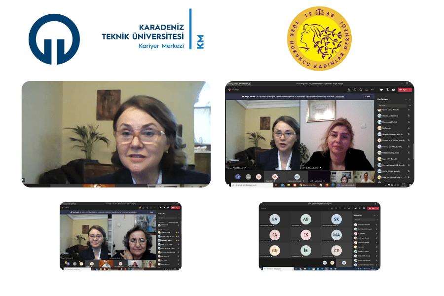 Türk Hukukçu Kadınlar Derneği ile KTÜ Kariyer Merkezi tarafından düzenlenen “İnsan Hakları Bağlamında Kadın Hakları ve Toplumsal Cinsiyet Eşitliği” semineri 08 Mart 2021 tarihinde online olarak gerçekleştirildi. Prof. Dr. Mine GÖZÜBÜYÜK TAMER moderatörlüğünde Türk  Hukukçu Kadınlar Derneği Başkanı Av. Süreyya Turan’ın sunum yaptı. Dünya Kadınlar Günü’nün kutlanma nedeninin ve tarihçesinin anlatılması ile başlayan sunum, kadın hakları ve kadın sağlığı konularında bilgilendirmelerle devam etti. Ayrıca seminerde, kadınların fiziksel, sosyal ve ruhsal sağlıklarının iyi olmasının çocukların ve aile bütünlüğünün sağlıklı olması açısından önemi, kadınların hijyen ve aile planlaması, kadın hakları konularında bilgilendirilmeleri ve bu tarz konular ile ilgili başvurabilecekleri kurum ve kuruluşlar hakkında bilgiler verildi.