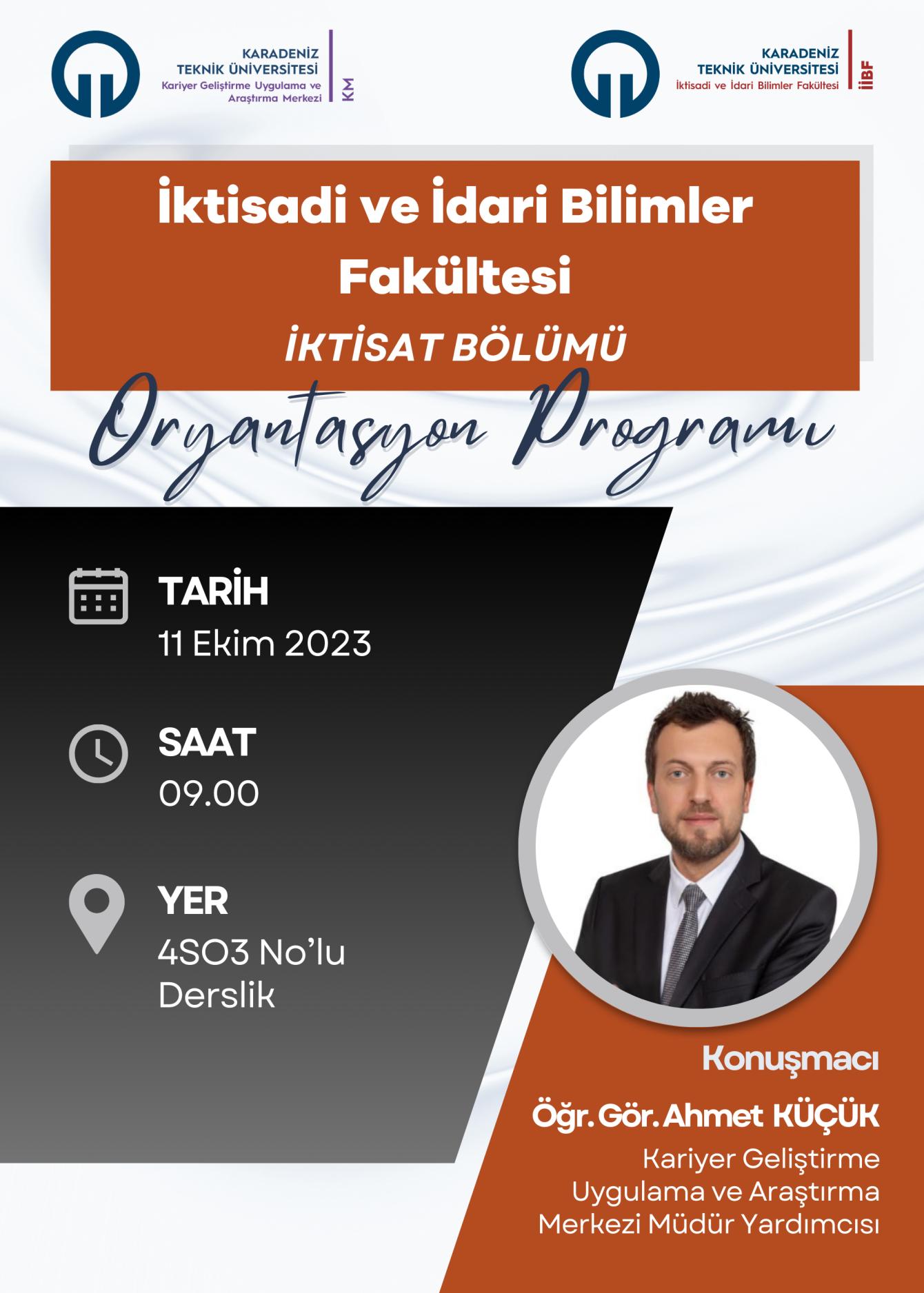 2023-2024 eğitim-öğretim yılında KTÜ İktisadi ve İdari Bilimler Fakültesi İktisat Bölümüne yeni kayıt yaptıran öğrencilerimiz için 11.10.2023 tarihinde saat 09:00 da 4SO3 No’lu derslikte oryantasyon programı düzenlendi. Oryantasyon programına Kariyer Geliştirme Uygulama ve Araştırma Merkezi (KM) Müdür Yardımcısı Öğr. Gör. Ahmet KÜÇÜK de katılım sağladı. Oryantasyon Programı’nda bölüm tanıtımından sonra KM Müdür Yardımcısı Öğr. Gör. Ahmet KÜÇÜK, KM bünyesinde gerçekleştirilen bireysel danışmanlık hizmeti, özgeçmiş hazırlama ve mülakat simülasyonları eğitimi, kariyer planlama dersi, sosyal sorumluluk projeleri, öğrenci kulüpleri ile kariyer günleri etkinlikleri, firmalarla iş, staj ve teknik gezi görüşmeleri, mezunlarla iletişim, Cumhurbaşkanlığı İnsan Kaynakları Ofisi (CBİKO) koordinatörlüğünde yürütülen Kariyer Fuarları, CBİKO Yetenek Kapısı Platformu’nun kullanımı ve sağladığı faydalar, CBİKO Kariyer Kapısı Platformu ve Ulusal Staj Programı, eğitim, etkinlik, akademik gelişim gibi konular hakkında bilgilendirmelerde bulundu.