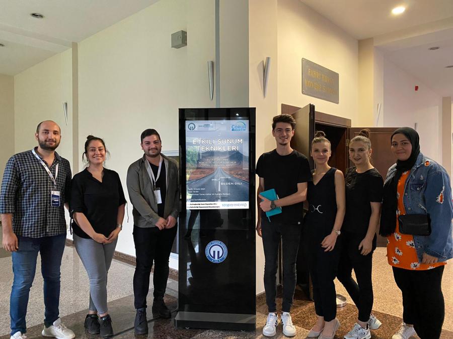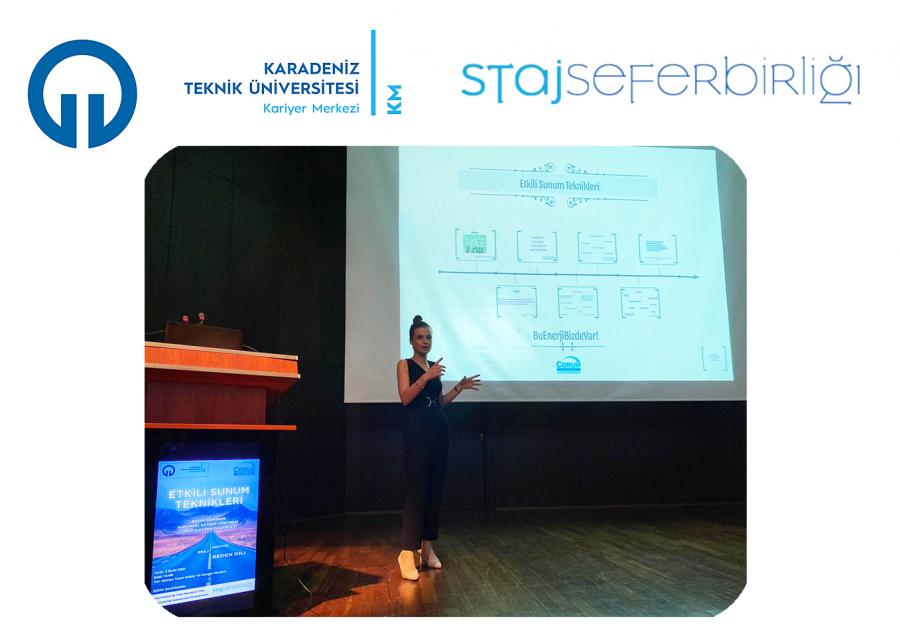 Kariyer Merkezi Stajyeri Erhan KALYONCU’nun moderatörlüğünde Kariyer Merkezi Müdür Yardımcısı Sayın Setenay ŞEVİK’in katkılarıyla ve Çoruh Elektrik Dağıtım A.Ş. Kurumsal İletişim Yönetmeni Sayın Büşra SARIİSMAİL’in sunumuyla gerçekleştirilen eğitimde “Etkili Sunum Teknikleri’nin” kariyer yolundaki öneminden bahsedildi ve sorular cevaplandı. SARIİSMAİL eğitime katkı sağlayan stajyerlere hediyelerini vermesi ve teşekkürlerini iletmesiyle eğitim son buldu.