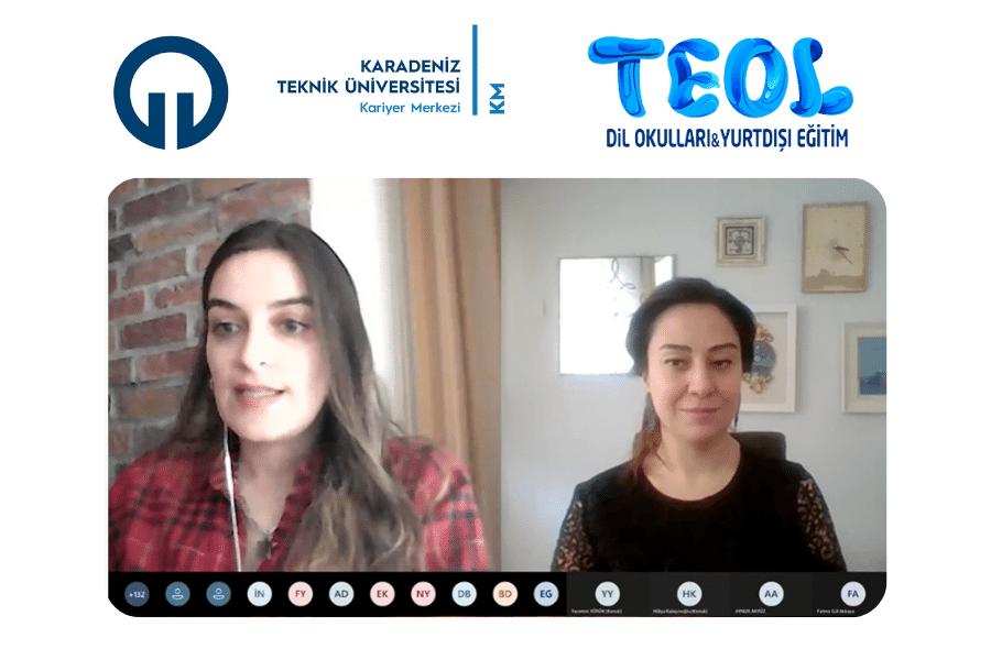 TEOL ile KTÜ Kariyer Merkezi tarafından düzenlenen “Yurtiçi ve Yurtdışı Yabancı Dil Eğitimleri” semineri 14 nisan 2021 tarihinde Kariyer Danışmanımız Öğr. Gör. Setenay ŞEVİK’in moderatörlüğünde, Yurtdışı Eğitim Koordinatörü Gülşah BAYTAR’ın sunumuyla online olarak gerçekleştirildi.