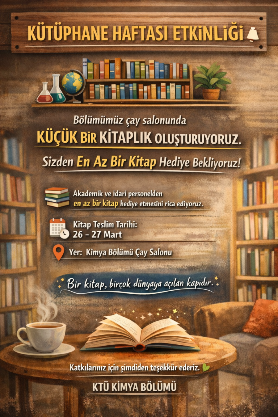 Karadeniz Teknik Üniversitesi Kimya Bölümü olarak, Kütüphane Haftası kapsamında anlamlı bir etkinliğe imza attık. Bölüm yönetimi tarafından, bölüm çay salonuna bir kitaplık yerleştirilerek küçük bir okuma alanı oluşturuldu.