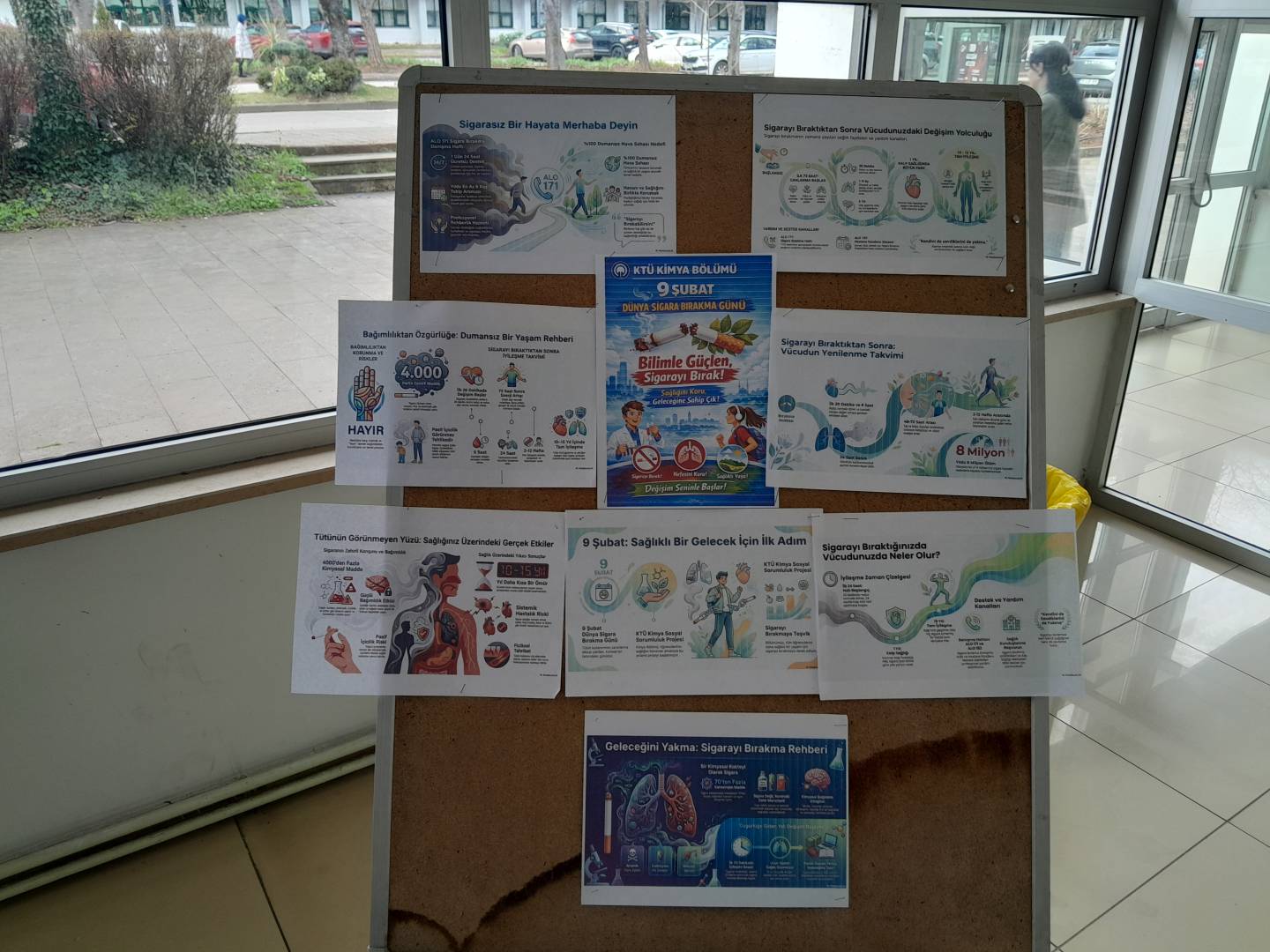 "Sürdürülebilir kalkınma hedeflerine yönelik yıl içerisinde düzenlenen etkinlik sayısı (3-Sağlık ve Kaliteli Yaşam)" kapsamında Karadeniz Teknik Üniversitesi Kimya Bölümü olarak, 9 Şubat Dünya Sigara Bırakma Günü kapsamında sosyal sorumluluk bilincini artırmaya yönelik bir etkinlik gerçekleştirdik. Bölümümüz B Blok girişine kurulan stantta gün boyunca öğrencilere sigaranın zararları hakkında bilgilendirme yapıldı.