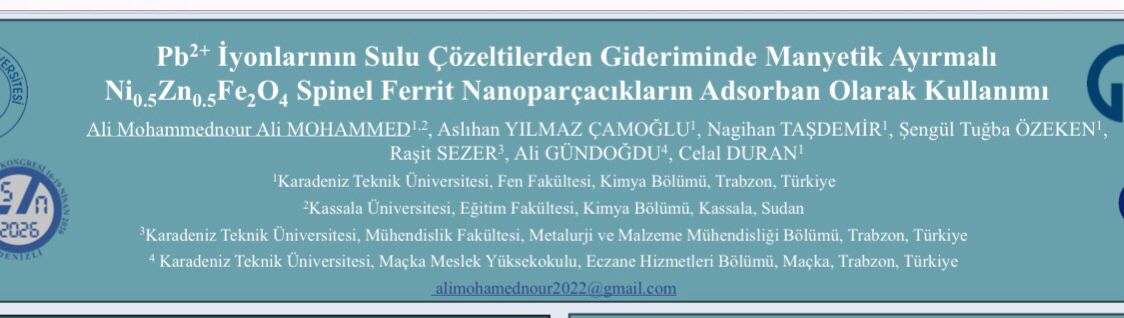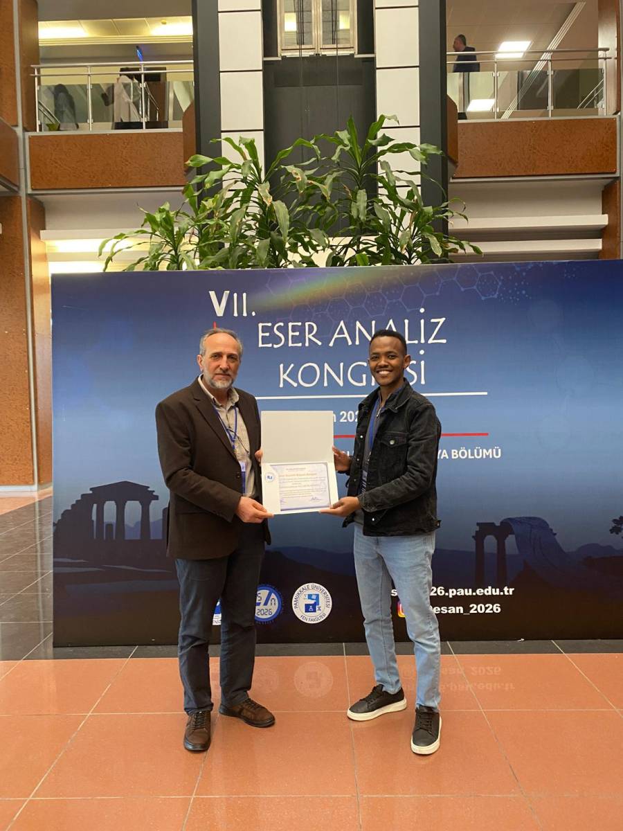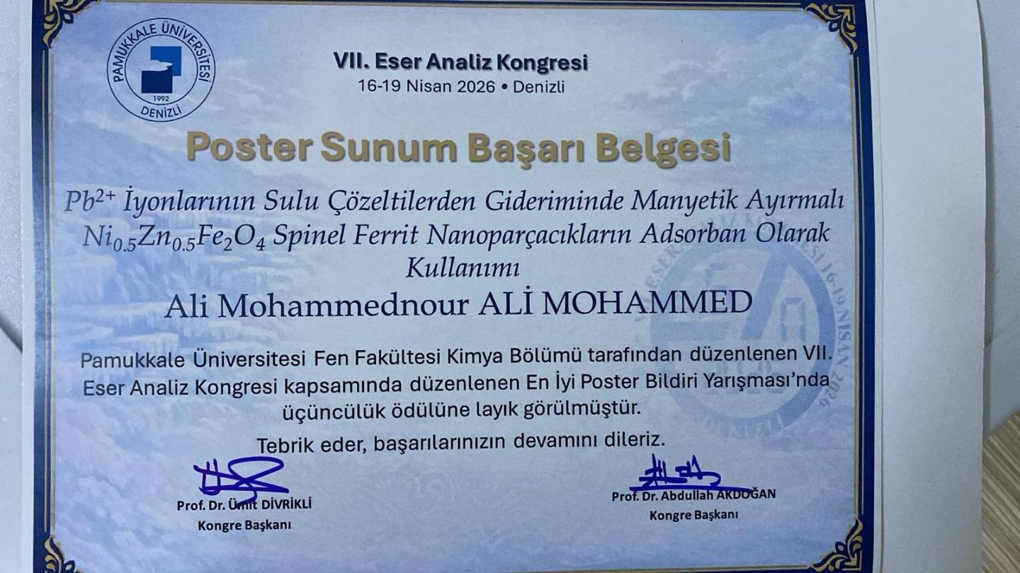 "Akademisyen/Öğrenci Ödülü - (PG2.2.5 Akademisyen/öğrenci bilim ödülü sayısı göstergesinde belirtilen ödül kategorileri dışındaki)" kapsamında Doktora Öğrencimiz Ali Mohammednour ALİ MOAMMED Pamukkale Üniversitesi Fen Fakültesi Kimya Bölümü tarafından düzenlenen VII. Eser Analiz Kogresi kapsamında düzenlenen En İyi Poster Bildiri Yarışması'nda üçüncülük ödülüne layık görülmüştür.