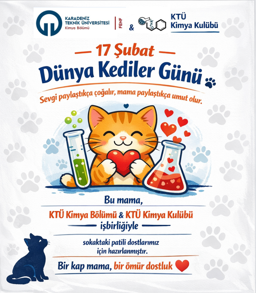 "Birimler veya öğrenciler tarafından yürütülen sosyal sorumluluk projesi" kapsamında 17 Şubat Dünya Kediler Gününde, 17.02.2026 tarihinde KTÜ Kimya Bölümü Yönetiminin koordinasyonuyla, KTÜ Kimya Kulübü üyesi öğrencilerimizin yürüttüğü çalışma doğrultusunda sokak hayvanları için mama hazırlandı ve hazırlanan mamalar kampüsün farklı noktalarında sokak hayvanlarına dağıtıldı. Proje kapsamıında hem dayanışma bilincimizi güçlendirdik hem de toplumsal sorumluluğumuzu yerine getirdik. Öğrencilerimizin gerçekleştirdiği bu etkinlik sayesinde sokakta yaşayan can dostlarımızın yanında olduk.