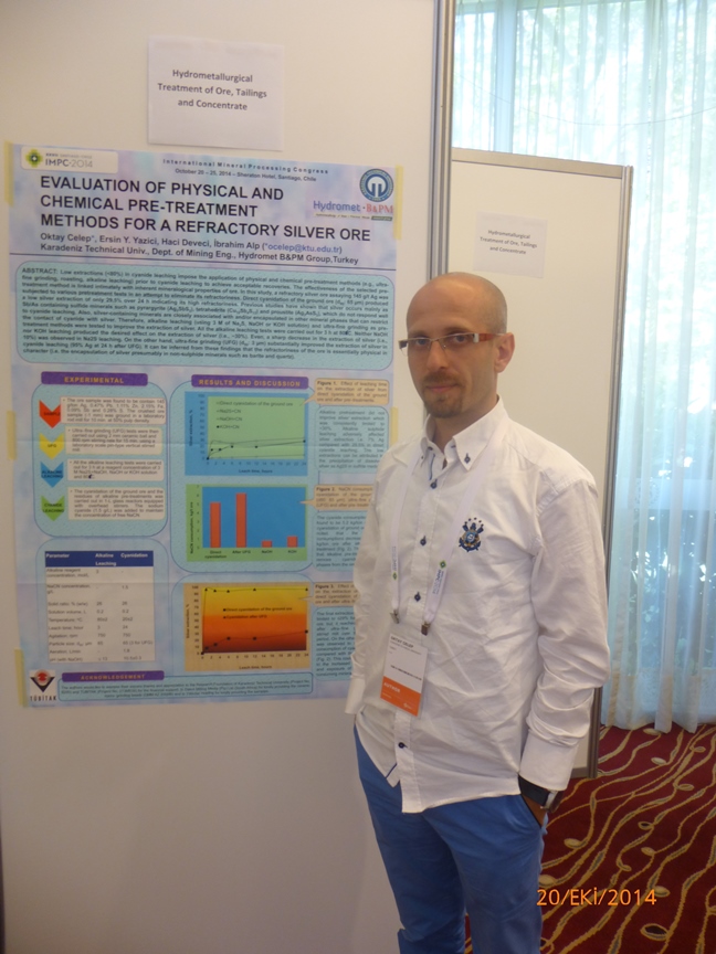 Bölümümüz Cevher-Kömür Hazırlama Anabilim dalı öğretim üyelerinden Yrd.Doç.Dr. Ersin Yazıcı ve Yrd.Doç.Dr. Oktay Celep 20-24 Ekim 2014 tarihleri arasında bu yıl 27’ncisi Şili’nin Santiago şehrinde düzenlenen International Mineral Processing Congress (IMPC) isimli kongreye katıldılar. Kongrede her biri 1 poster ve 1 sözlü sunum olmak üzere toplam 2 poster ve 2 sözlü sunum gerçekleştiren öğretim üyelerimiz bir bakır-molibden flotasyon tesisine de teknik ziyarette bulundular.