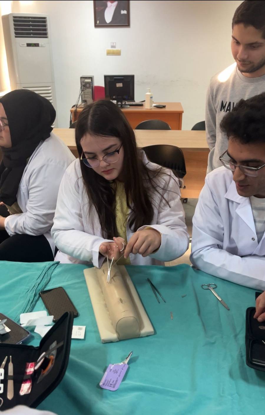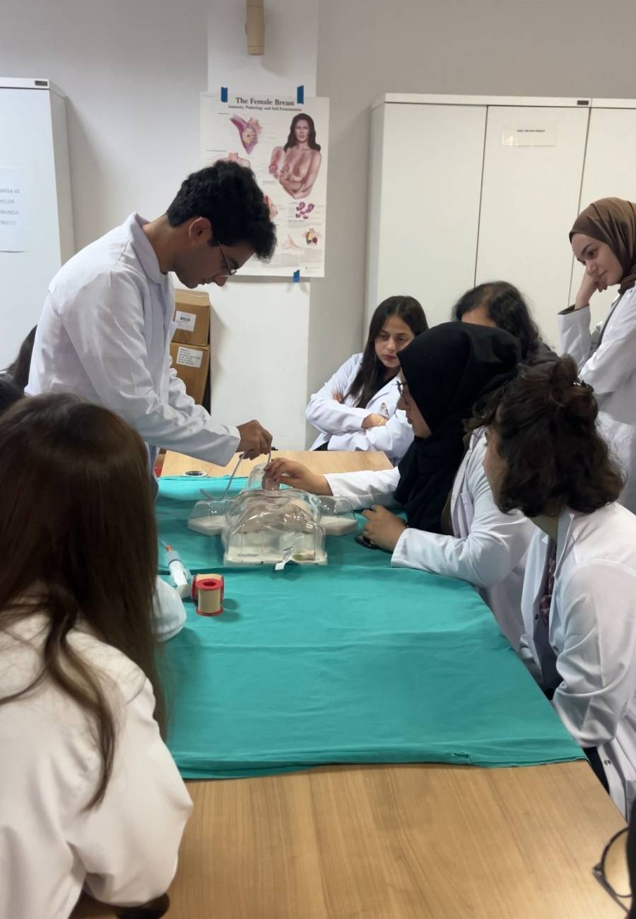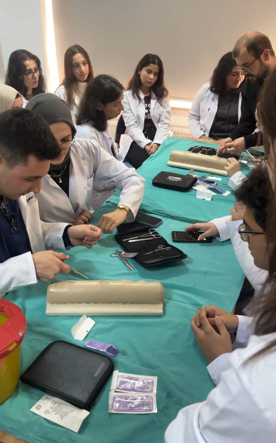 Etkinlik kapsamında, öğrencilere yönelik temel klinik beceriler üzerine bilgilendirme ve uygulama çalışmaları gerçekleştirildi. Üç istasyondan oluşan eğitimde, katılımcılara sütur atma, nazogastrik sonda uygulaması ve üriner sonda uygulaması hakkında teorik bilgiler aktarıldı ve her öğrenci bu becerileri uygulamalı olarak deneyimleme fırsatı buldu.