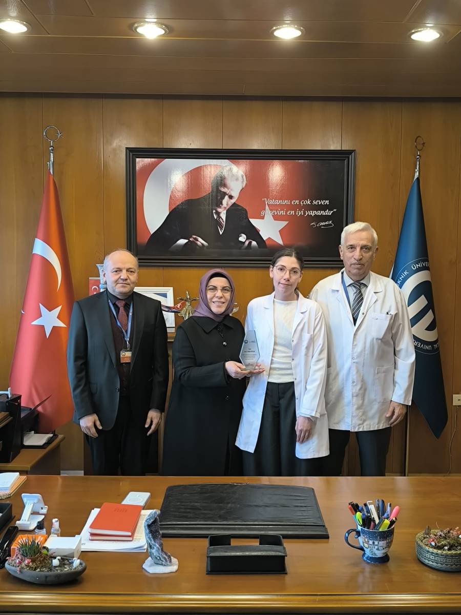 Fakültemizde uzmanlık eğitimlerini tamamlayan Aile Hekimliği Anabilim Dalından Uzm. Dr. Merve DİLEKCİ, Nöroloji Anabilim Dalından Uzm. Dr. Hande USTALAR, Anesteziyoloji ve Reanimasyon Anabilim Dalından Uzm. Dr. Eren Hakkı İŞCİ ve İç Hastalıkları Anabilim Dalından Hematoloji Yan Dal Uzm. Dr. Turhan KÖKSAL'a Dekanımız Prof. Dr. Sevdegül AYDIN MUNGAN tarafından plaketleri takdim edildi.