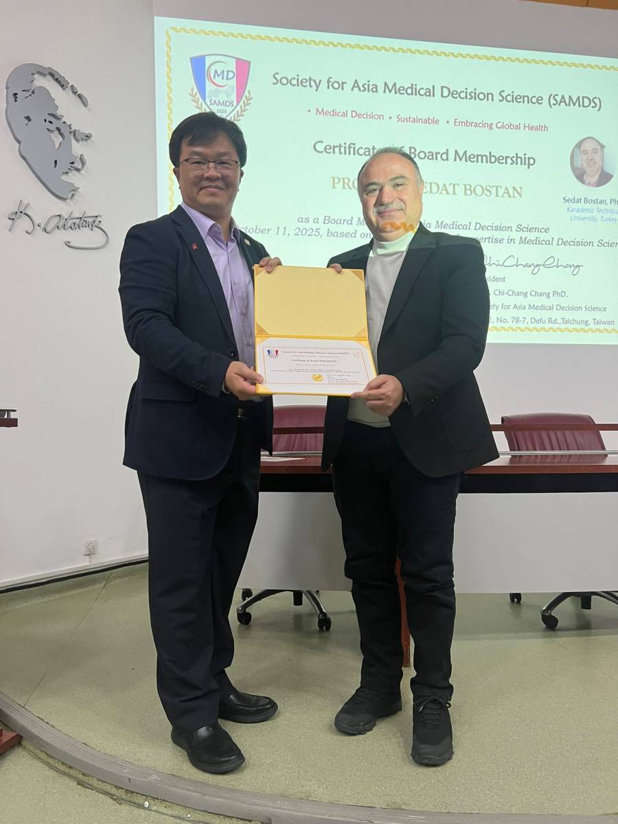 Dış İlişkiler Genel Koordinatörlüğü, Sağlık Bilimleri Enstitüsü ve Fakültemizin ortak organizasyonuyla, 30 Ekim 2025 tarihinde Fakültemiz Aydın İnal Amfisi'nde, Tayvan'da bulunan Chung Shan Sağlık Bilimleri Üniversitesi öğretim üyesi ve aynı zamanda Asya Tıbbi Teşhis Bilimi Topluluğu başkanlığını da yürütmekte olan Prof. Dr. Chi-Chang Chang tarafından "Yeni Nesil Sağlık Hizmeti Sunumu için Yapay Zeka Destekli Tıbbi Teşhis Bilimi" konulu seminer düzenlendi. Seminer bitiminde Prof. Dr. Chi-Chang Chang'a Dekanımız Prof. Dr. Sevdegül AYDIN MUNGAN tarafından plaket takdim edildi ve Sağlık Bilimleri Enstitüsü Müdürü Prof. Dr. Sedat BOSTAN tarafından katılım sertifikası verildi. Etkinliğe Dış İlişkiler Genel Koordinatörü Prof. Dr. Sercan EROL ve Değişim Programları Koordinatörüğü ekibinden Öğr. Gör. Zehra ŞAHİN BEKTAŞ da katılım sağladılar.