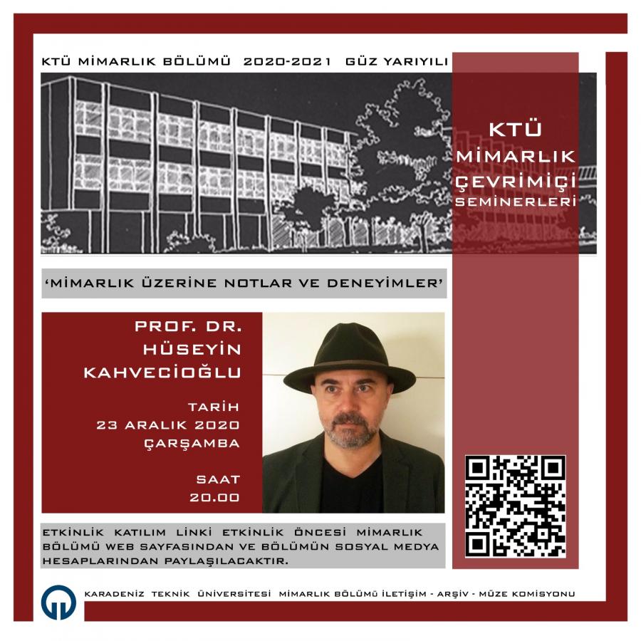 Mimarlık Üzerine Notlar ve Deneyimler Karadeniz Teknik Üniversitesi Mimarlık Bölümü İletişim-Arşiv-Müze Komisyonu tarafından düzenlenen Mimarlık Bölümü Çevrimiçi Seminerleri kapsamında 23 Aralık 2020 Çarşamba günü saat 20.00’de Prof. Dr. Hüseyin Kahvecioğlu ‘Mimarlık Üzerine Notlar ve Deneyimler’ konulu semineri ile bizlerle buluşacaklardır. Akademik personelimize ve öğrencilerimize önemle duyurulur.