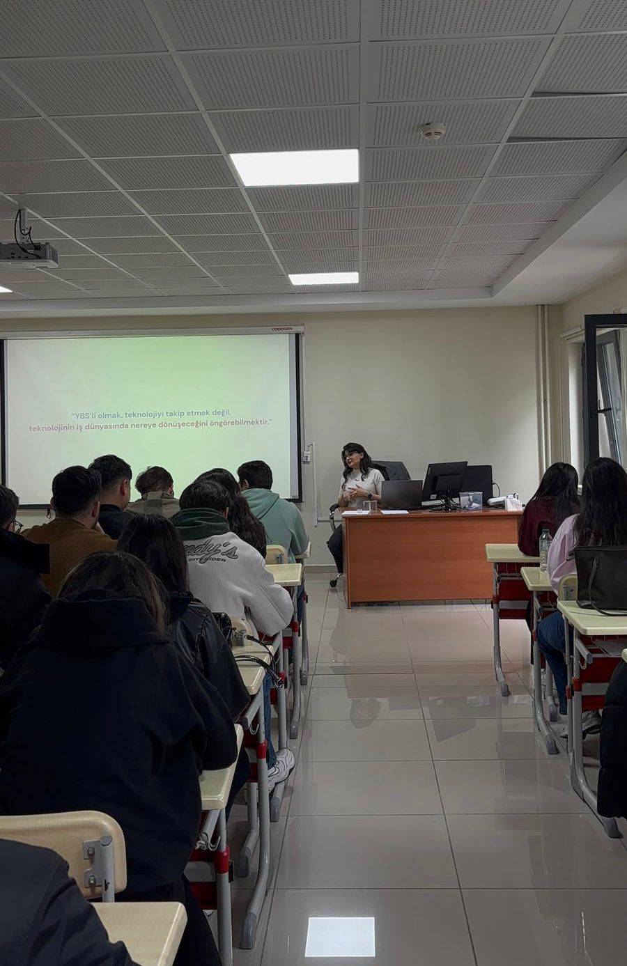 A seminar organized by the Management Information Systems Department of Trabzon University was held with high student participation. Research Assistant Beyza GÜDEK, who participated as a speaker, provided a general overview of the development of the MIS field from the past to the present, its current place in the business world, and its future direction.