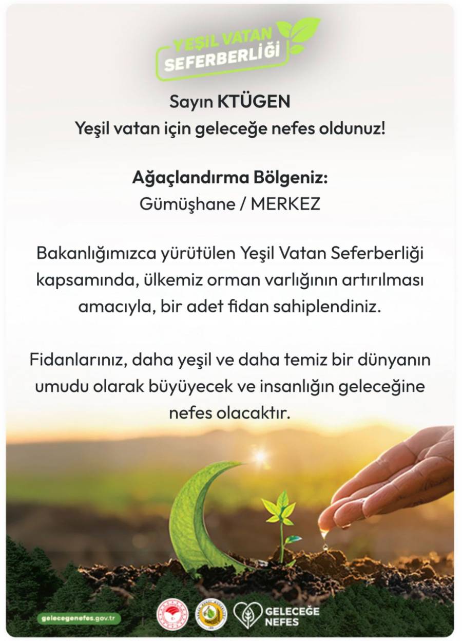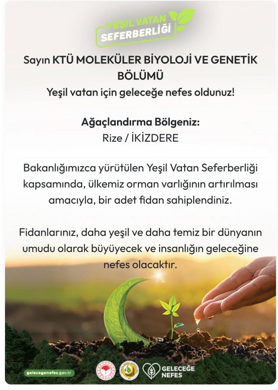 Karadeniz Teknik Üniversitesi Moleküler Biyoloji ve Genetik Bölümü öğrencileri, sosyal sorumluluk projesi kapsamında 11 Kasım Milli Ağaçlandırma Günü dolayısıyla anlamlı bir etkinliğe imza attı. KTÜGEN öğrenci kulübü iş birliğiyle düzenlenen etkinlikte, Orman Genel Müdürlüğü tarafından ağaç dikim alanı olarak belirlenen Trabzon İl Jandarma Komutanlığı bahçesinde fidan dikimi gerçekleştirildi. Etkinlik kapsamında bölüm öğrencileri, bölüm ve öğrenci kulübü adına fidan sahiplenerek doğaya katkı sundu. Öğrenciler, çevre bilincinin artırılması ve sürdürülebilir bir gelecek için farkındalık oluşturmayı amaçladıkları bu etkinlikte doğayla iç içe keyifli bir gün geçirdiler.