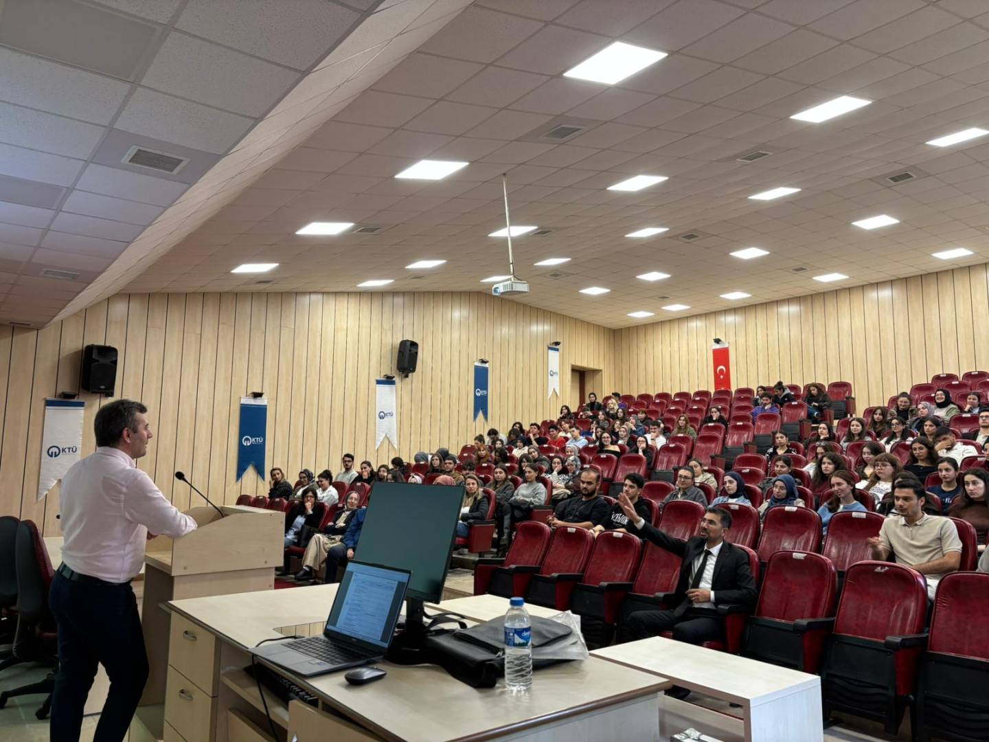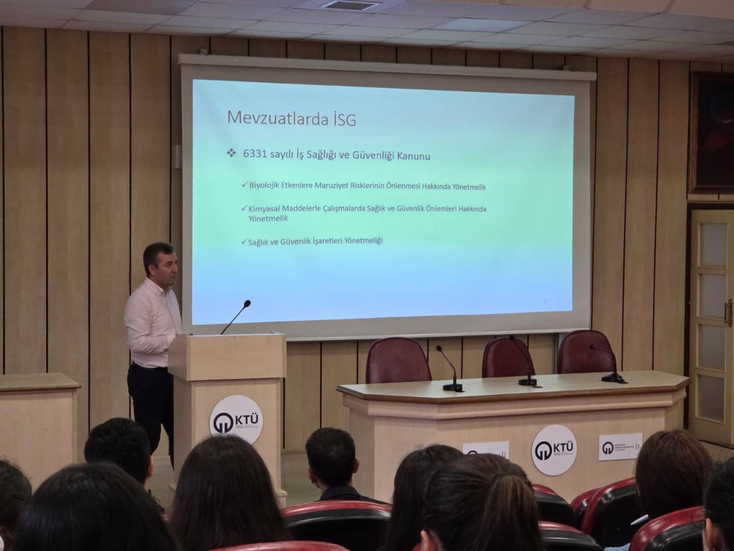 Eğitimin konuşmacısı, İş Sağlığı ve Güvenliği Uzmanı ve KTÜ Fen Bilimleri Enstitüsü İş Sağlığı ve Güvenliği Anabilim Dalı Başkanı Prof. Dr. Tayfun Dede oldu. Prof. Dr. Dede, öğrencilere iş sağlığı ve güvenliğinin temel prensipleri, risk faktörleri, laboratuvar ve çalışma alanlarında dikkat edilmesi gereken kurallar hakkında kapsamlı bilgiler aktardı. Özellikle laboratuvar çalışmalarında güvenli davranış biçimlerinin önemine vurgu yapan Dede, hem bireysel hem de toplu güvenliği sağlamak için alınması gereken önlemler üzerinde durdu.