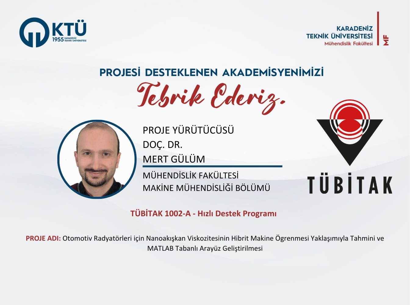 Fakültemiz Makine Mühendisliği Bölümü öğretim üyelerinden Doç. Dr. Mert GÜLÜM’'ün “Otomotiv Radyatörleri için Nanoakışkan Viskozitesinin Hibrit Makine Ögrenmesi Yaklaşımıyla Tahmini ve MATLAB Tabanlı Arayüz Geliştirilmesi” başlıklı projesi, “TÜBİTAK 1002-A Hızlı Destek Programı” kapsamında desteklenmiştir.