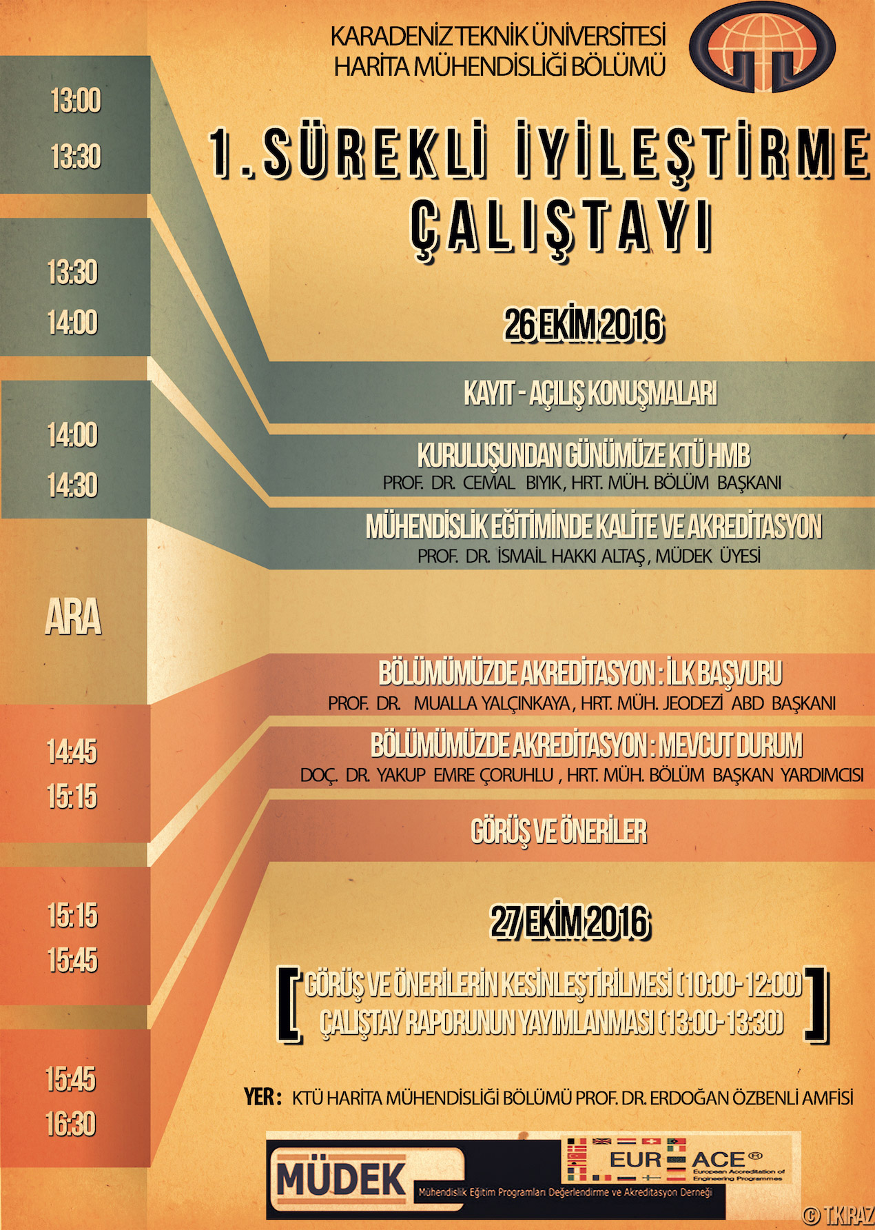 Harita Mühendisliği Bölümü 1. Sürekli İyileştirme Çalıştayı 26 Ekim 2016 Çarşamba günü saat 13:00’de Prof.Dr. Erdoğan ÖZBENLİ Anfisinde gerçekleştirilecektir. Çalıştayda mühendislik eğitiminde akreditasyon, akreditasyonun bağımsız kuruluşlarla uluslararası standartlarda yürütülmesinin önemi ve Harita Mühendisliği Bölümünde 2009 yılından beri başlatılan akreditasyon çalışmalarının süreci hakkında değerlendirmeler yapılarak, bölümün iç ve dış paydaşların görüş ve önerileri alınacaktır.