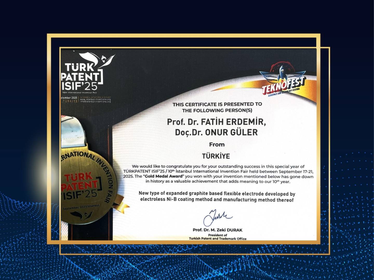 17-21 Eylül 2025 tarihleri arasında İstanbul’da düzenlenen TÜRKPATENT ISIF’25 / 10. İstanbul Uluslararası Buluş Fuarı’nda, “Yeni Tip Genişletilmiş Grafit Bazlı Esnek Elektrot,Elektrolitsiz Ni-B Kaplama Yöntemi ve Buna Ait Üretim Yöntemi” başlıklı çalışmalarıyla Altın Madalya Ödülü’ne layık görüldüler.