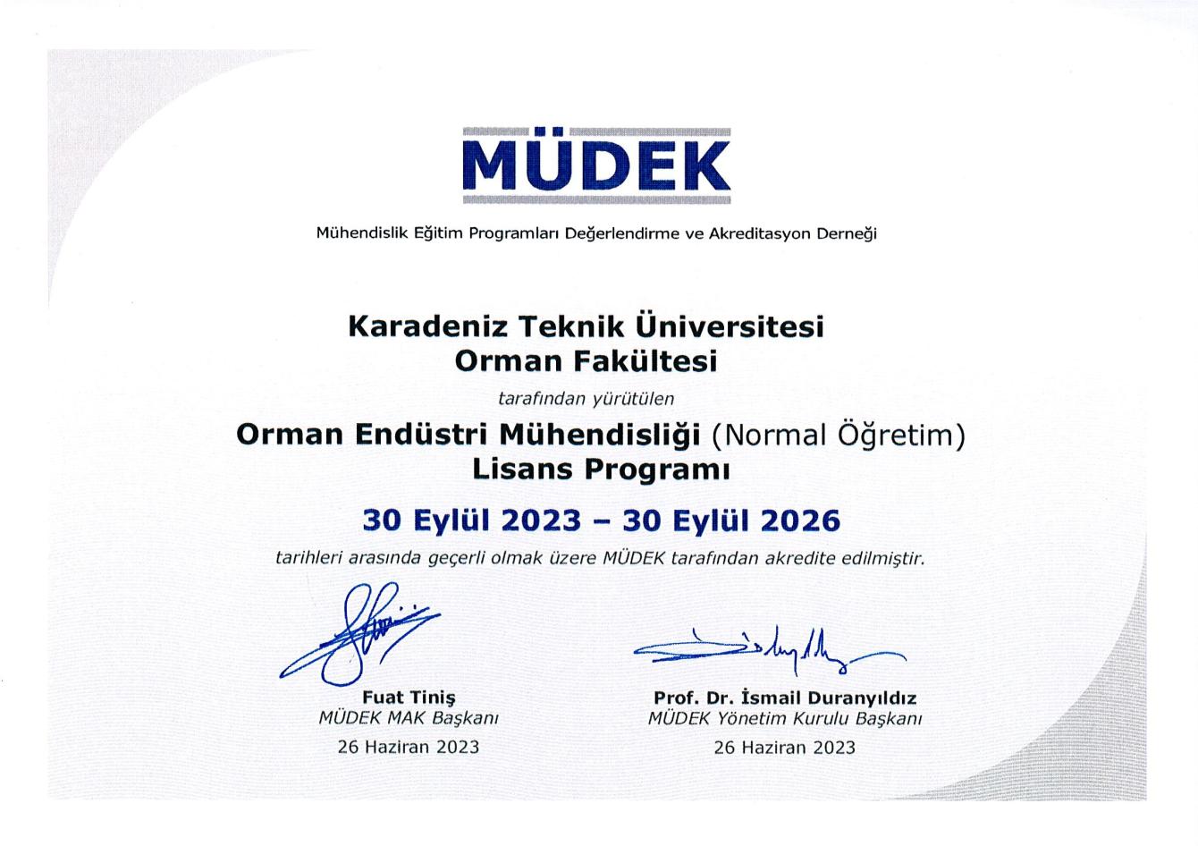 Mühendislik Eğitim Programları Değerlendirme ve Akreditasyon Derneği (MÜDEK) tarafından yapılan değerlendirme kapsamında, ilk olarak 01.05.2015 tarihinde akredite edilen Orman Endüstri Mühendisliği Programımızın, akreditasyon süresi yapılan MÜDEK değerlendirmesi sonucunda 30 Eylül 2026 tarihine kadar uzatılmıştır.