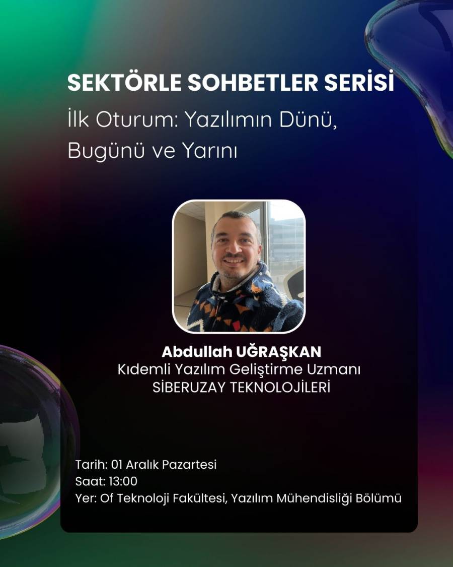 Bölümümüzde, 1 Aralık 2025 Pazartesi günü saat 13.00’te, sektörde uzun yıllardır görev yapan Kıdemli Yazılım Geliştirme Uzmanı Abdullah UĞRAŞKAN tarafından Sektör Deneyimleri konulu bir söyleşi gerçekleştirilecektir. Tüm öğrencilerimiz davetlidir.