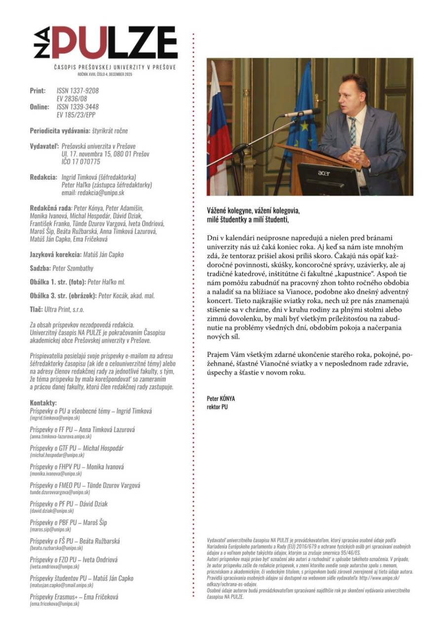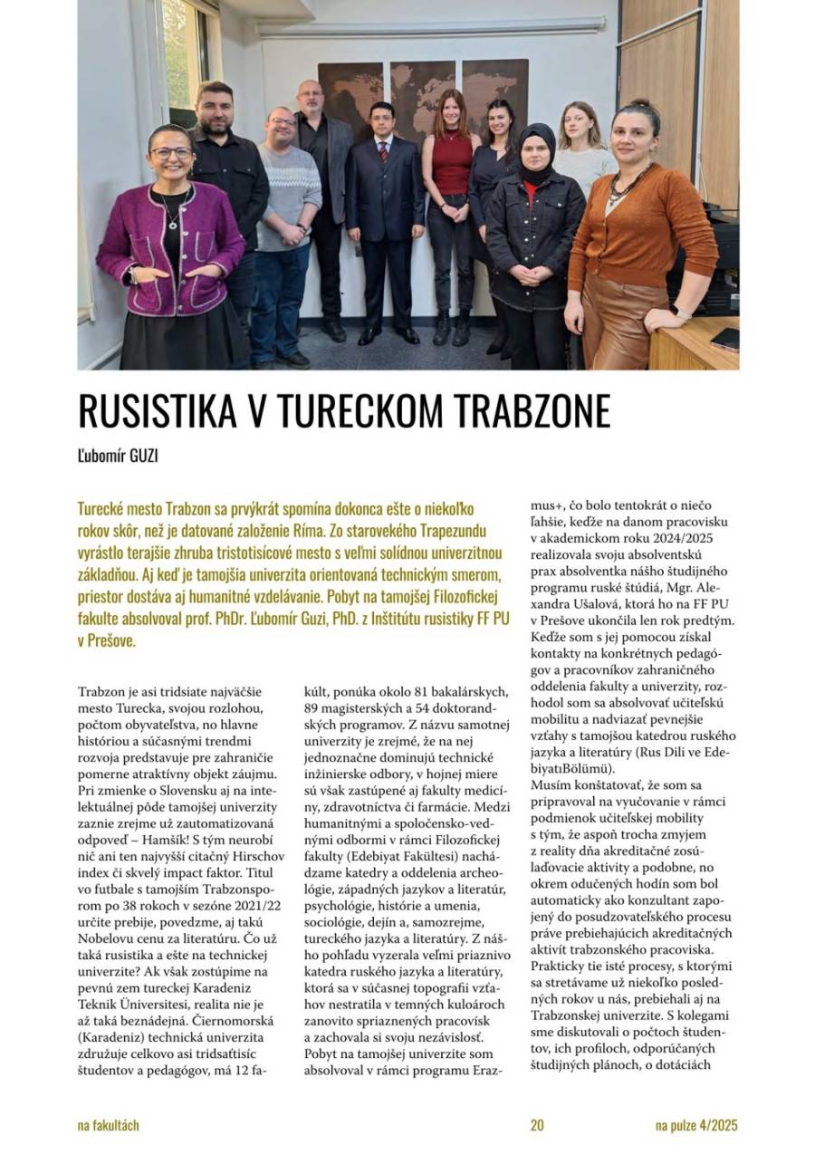 Slovakya’nın köklü eğitim kurumlarından Preşov Üniversitesi tarafından yayımlanan Na Pulze dergisinin 4 Aralık 2025 tarihli sayısında Preşov Üniversitesi Rus Filolojisi Bölümü Öğretim Üyesi Prof. Dr. Lyubomir GUZİ, Erasmus+ kapsamında Bölümümüze gerçekleştirilen seyahati hakkındaki deneyimlerini paylaştı.