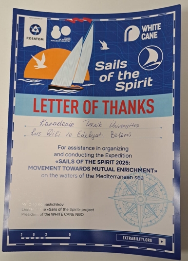 Bölümümüz, engelli ve engelsiz bireyleri bir araya getiren uluslararası "Ruhun Yelkenleri" projesinin 15-16 Ekim 2025 tarihlerinde Trabzon'da düzenlenen etkinliklerine katılmıştır. Bu önemli proje; "Extrability" olarak ifade edilen, zorlukların aşılmasıyla ortaya çıkan benzersiz yeteneklerin gelişimini desteklemeyi amaçlamaktadır. 2011 yılında başlatılan "Ruhun Yelkenleri" projesi, 2016 yılından itibaren ANO "Beyaz Baston", Rosatom Devlet Kuruluşu ve Rossotrudniçestvo Federal Ajansı tarafından desteklenmektedir.