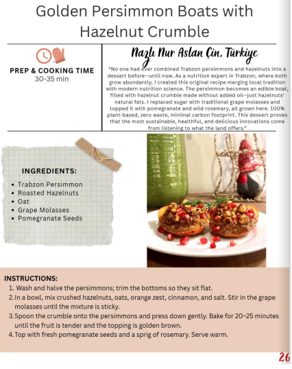 Beslenme ve Diyetetik Bölümü öğretim üyelerinden Doç. Dr. Nazlı Nur Aslan Çin, Avrupa iş birliği ağı COST Action "FLAVOURsome" (CA22161) kapsamında derlenen uluslararası tarif kitabında yer alarak Karadeniz Teknik Üniversitesi'ni temsil etmiştir. Sürdürülebilir gıda sistemleri ve lezzet inovasyonunu konu alan proje çerçevesinde düzenlenen bitkisel bazlı tarif yarışmasına katılan Doç. Dr. Aslan Çin'in özgün reçetesi, "Christmas Edition 2025" resmi tarif kitabında yer almaya hak kazanmıştır. "Golden Persimmon Boats with Hazelnut Crumble" adını taşıyan tarif; bölgemizin yerel ürünleri olan Trabzon hurması ve fındığını geleneksel üzüm pekmezi ile bir araya getirmektedir. Yalnızca beş bitkisel malzemeyle hazırlanan reçete, sıfır atık ve düşük karbon ayak izi ilkelerini temel almakta; sürdürülebilir beslenme ile yerel gıda kültürünün uluslararası arenada nasıl buluşabileceğini somut bir örnekle ortaya koymaktadır. Avrupa genelinden araştırmacıların katkılarıyla oluşturulan tarif kitabı, COST Action FLAVOURsome'un resmi dijital yayını olarak erişime açılmıştır. Doç. Dr. Aslan Çin'i bu başarısından dolayı tebrik eder, çalışmalarında başarılar dileriz.
