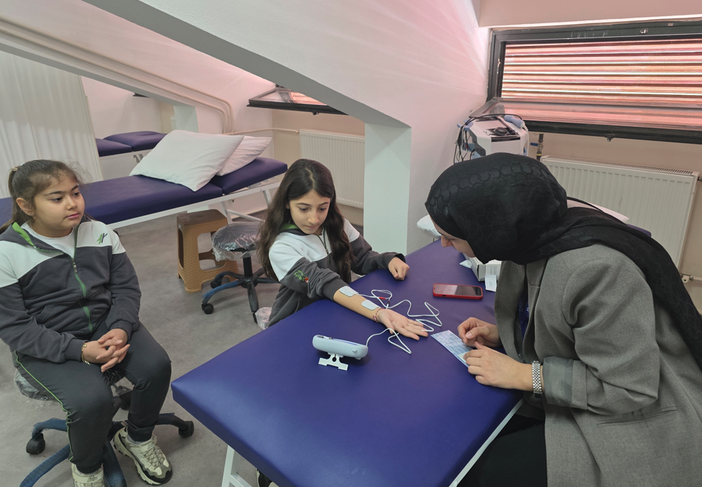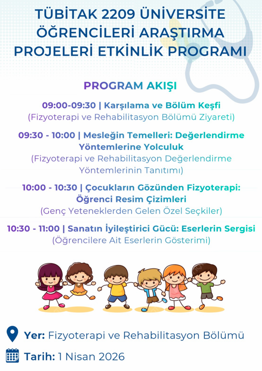 1 Nisan Çarşamba günü saat 09.00’da Fizyoterapi ve Rehabilitasyon Bölüm binasında, İlke Birey Okulları, Ahmet Yahya Subaşı İlkokulu ve Ticaret İlkokulu öğrencilerine yönelik bir farkındalık etkinliği gerçekleştirildi. Etkinlik, proje yürütücülüğünü Sena Özdemir, danışmanlığını Prof. Dr. Arzu Erden Güner, eğitmenliğini ise Öğr. Gör. Ufuk Kandaz’ın üstlendiği 2209-TÜBİTAK Projesi kapsamında yürütülen “İlkokul Öğrencilerinin Fizyoterapistlik Mesleği ile İlgili Bilinçlendirilmesi ve Farkındalıklarının Artırılması için Geliştirilen Sağlıklı Kahramanlar Eğitim Paketi'nin İncelenmesi” başlıklı çalışma çerçevesinde düzenlendi. Çocuklarda mesleki farkındalığı erken yaşta geliştirmeyi amaçlayan proje kapsamında misafir öğrenciler eğitici ve eğlenceli etkinliklerle fizyoterapistlik mesleğini yakından tanıma fırsatı buldu. Kısa bir egzersiz seansının ardından laboratuvarlardaki cihazları deneyimleyen öğrenciler, mesleğin uygulamalı yönlerini gözlemledi. Etkinliğin sonunda ise çocukların gözünden fizyoterapistlik mesleğini yansıtan resim çizme çalışması gerçekleştirildi. Çizilen resimler sergilenerek etkinlik tamamlandı.