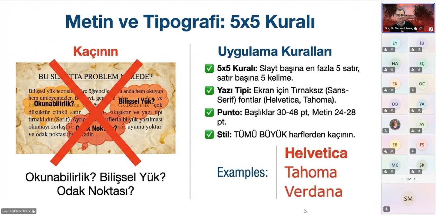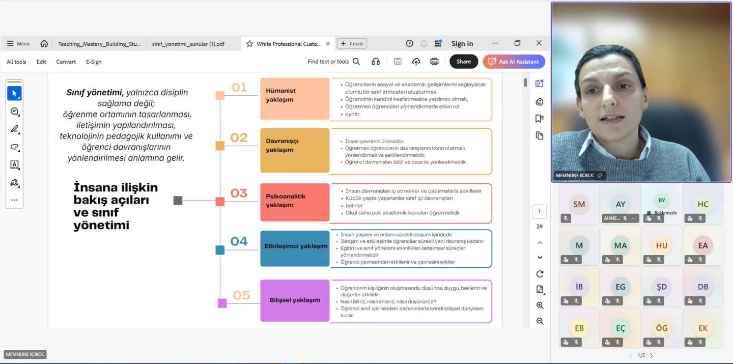 Toplam 45 saat süren program, 26–30 Ocak 2026 tarihleri arasında Pazartesi–Cuma günleri 09.30–17.00 saatleri arasında canlı dersler şeklinde yürütüldü. Program süresince katılımcılara; öğretim tasarımı, ölçme ve değerlendirme, teknoloji entegrasyonu, yapay zekâ destekli eğitim uygulamaları ile pedagojik ve iletişimsel yetkinliklerin geliştirilmesine yönelik kapsamlı içerikler sunuldu.